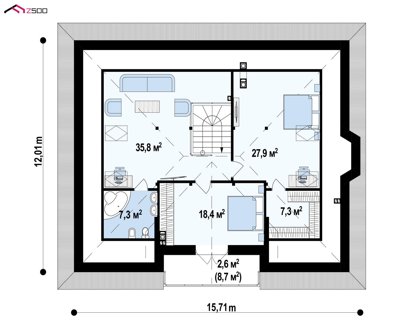 Z10 stu bk v1 представляет собой проект комфортного дома с открытой мансардой (вариант проекта Z10) c измененной планировкой.
