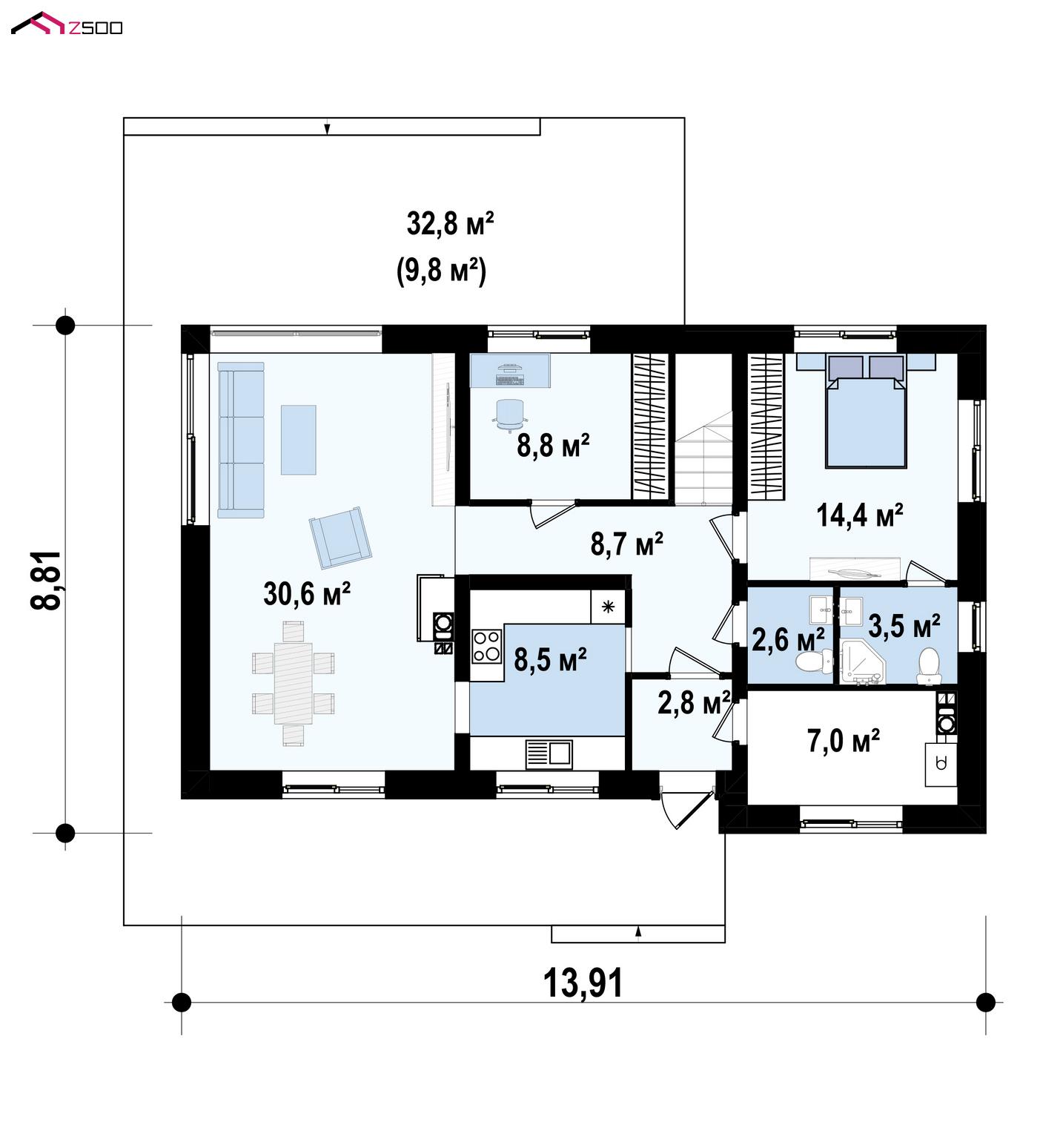 | Гостиная+ столовая | 30.6 ㎡ |