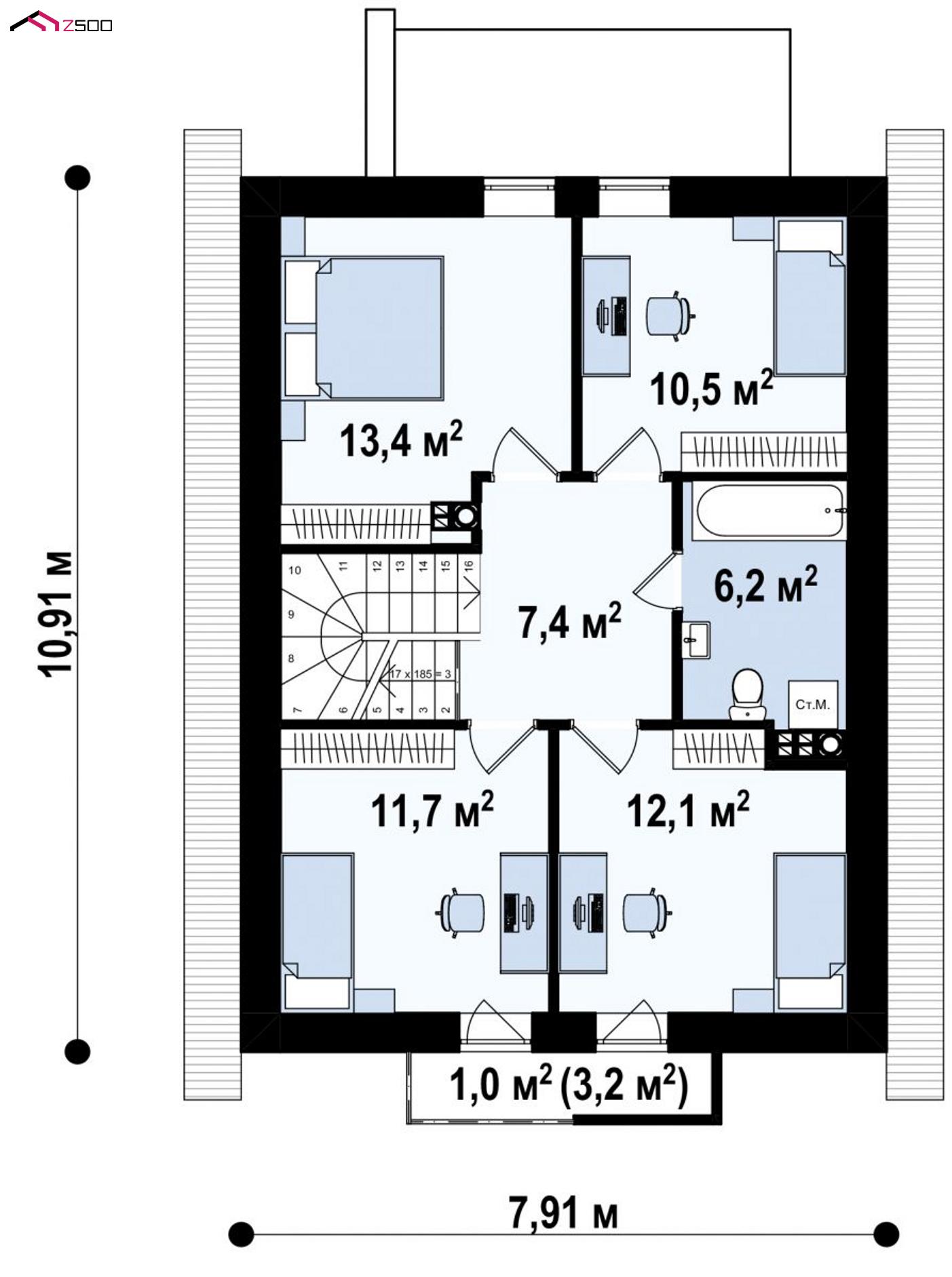Z177 + представляет собой проект мансардного дома с 4 спальнями и кабинетом.