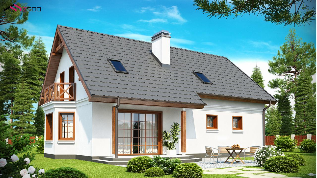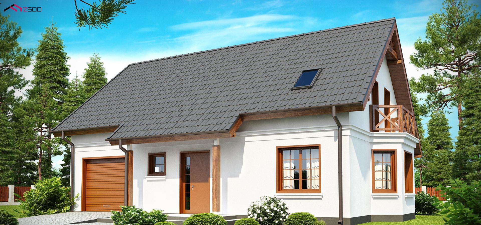 Элегантный дом простой формы со встроенным гаражом, эркером и балконом над ним.