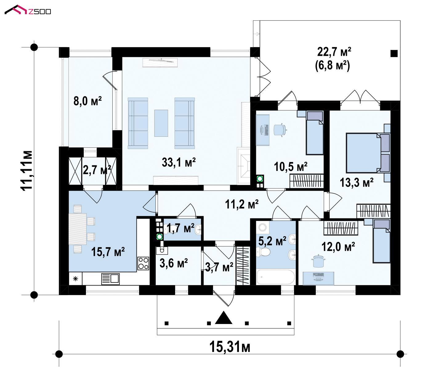 Одноэтажный дом с крытой террасой и оранжереей, электрический котел
