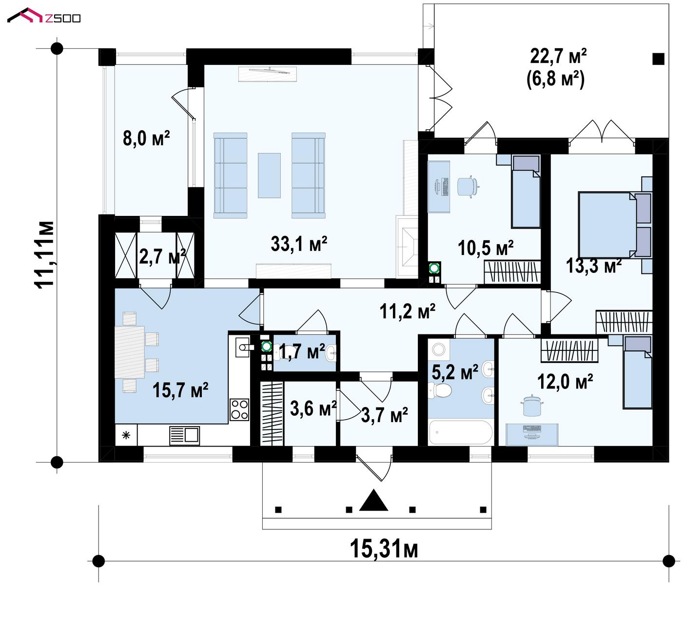 Традиционный одноэтажный дом Z185 с крытой террасой и оранжереей имеет