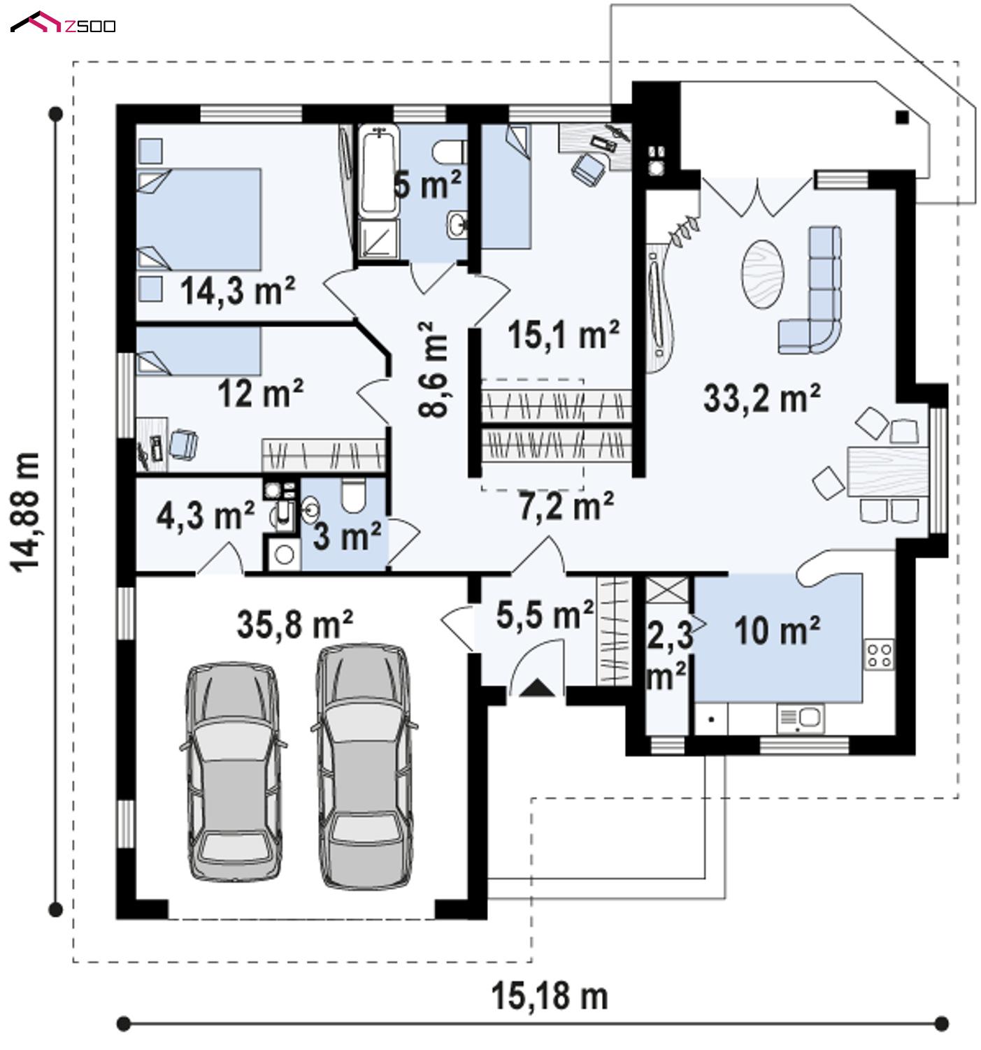 Проект Z19 — это одноэтажный удобный дом с фронтальным гаражом для