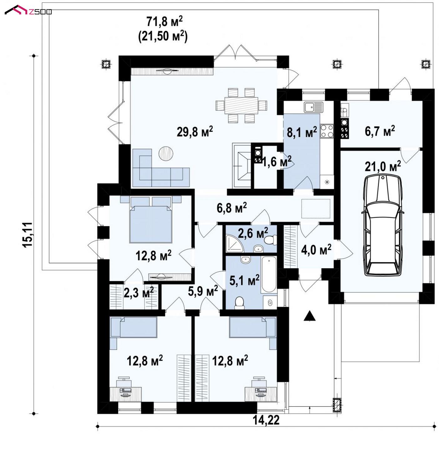 Вариант проекта одноэтажного дома Z204 с гаражом для одной машины.