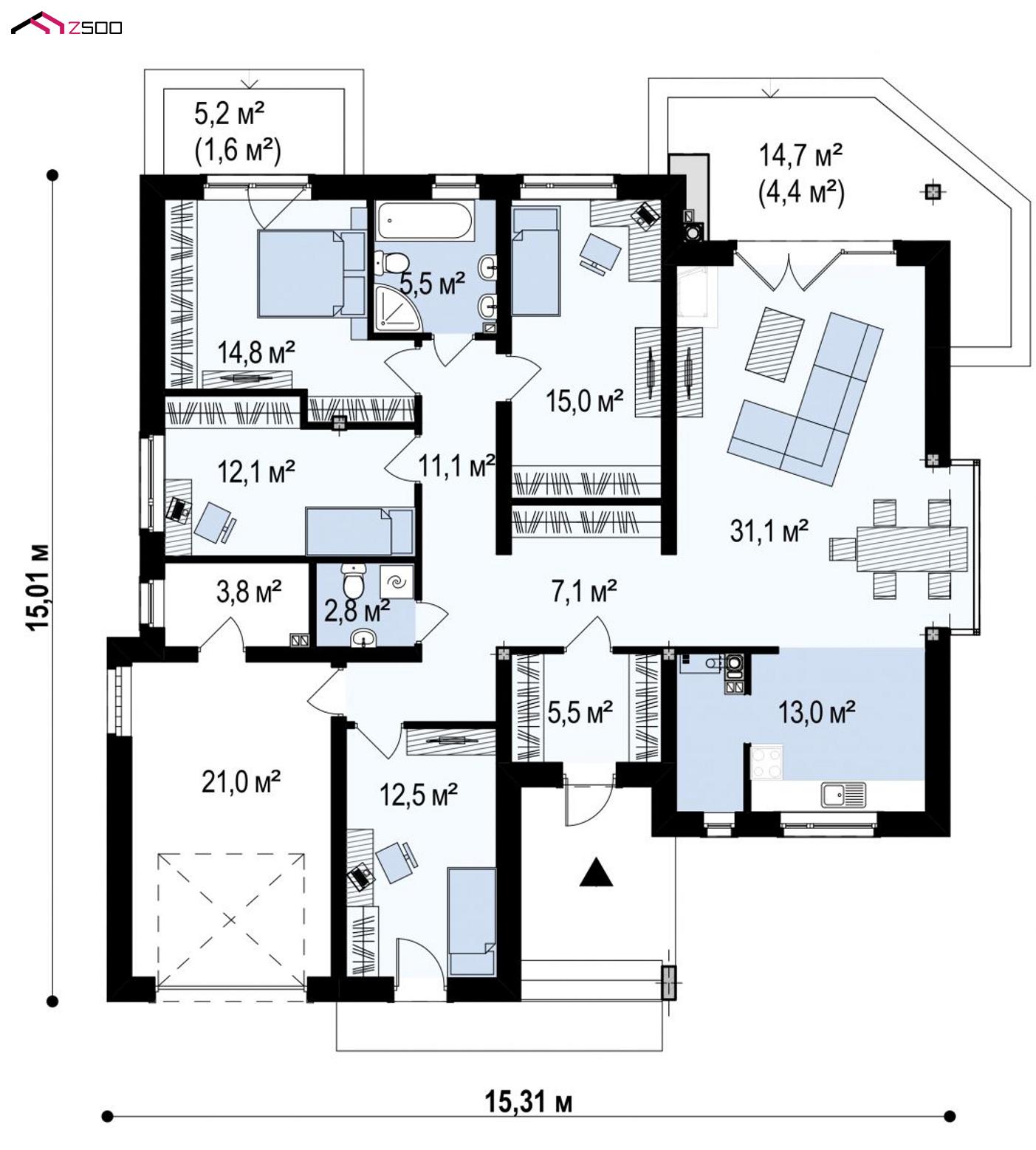 Практичный одноэтажный дом с четырьмя спальнями и гаражом.