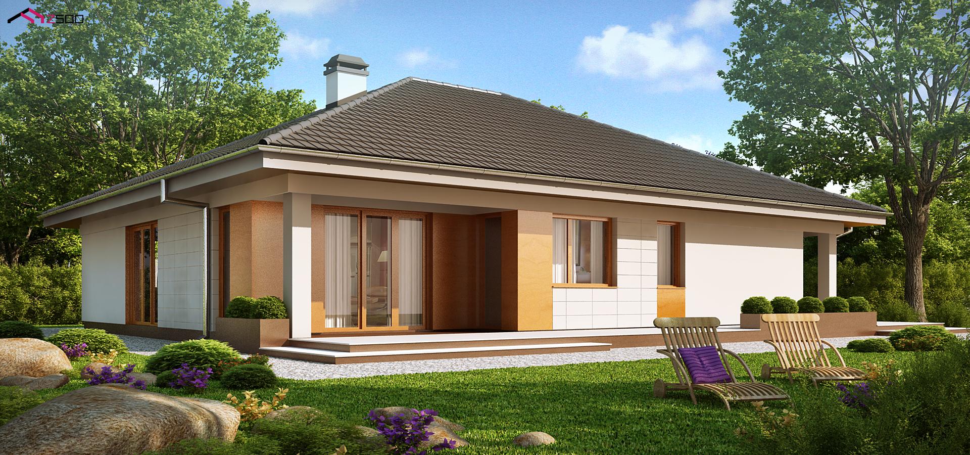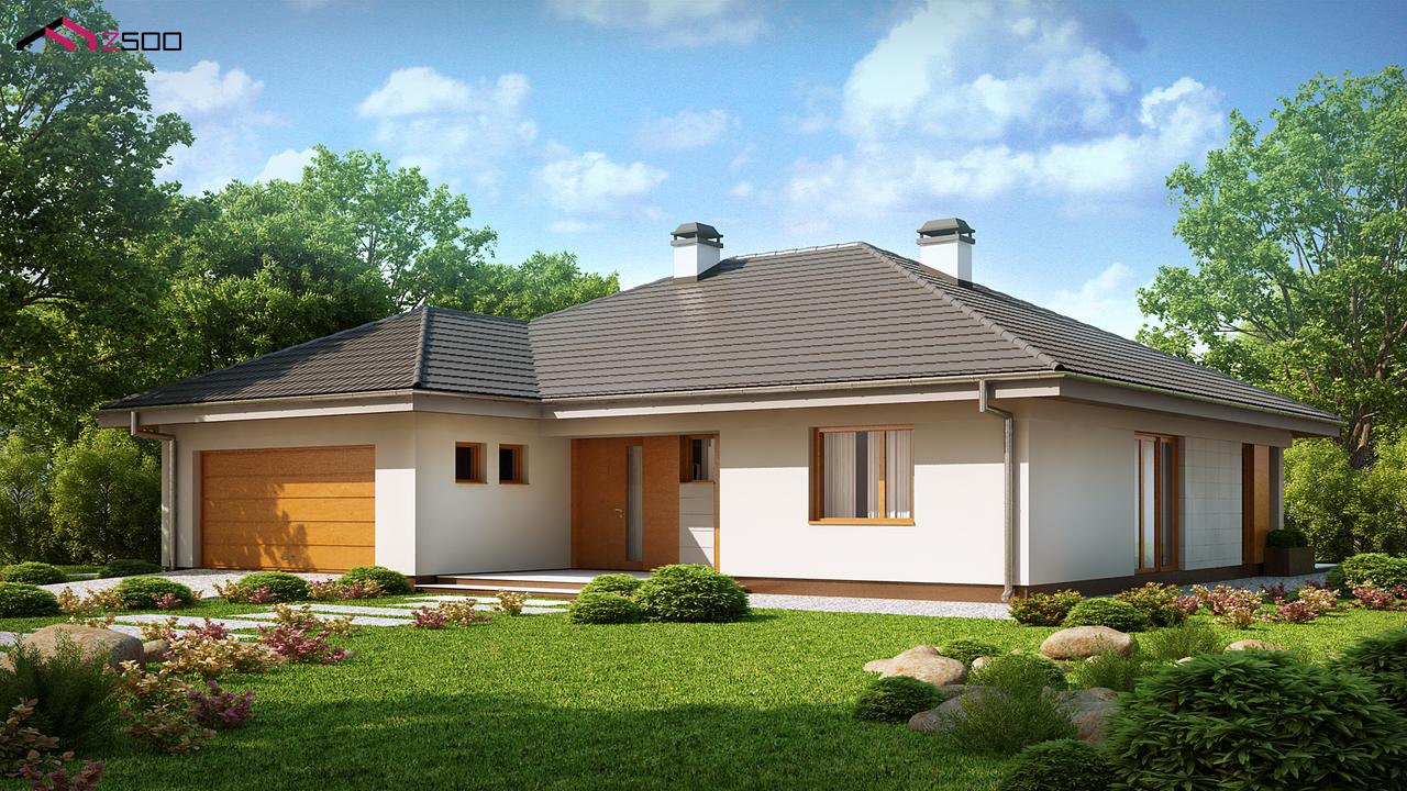 Практичный одноэтажный дом с гаражом для двух автомобилей и большим хозяйственным помещением.