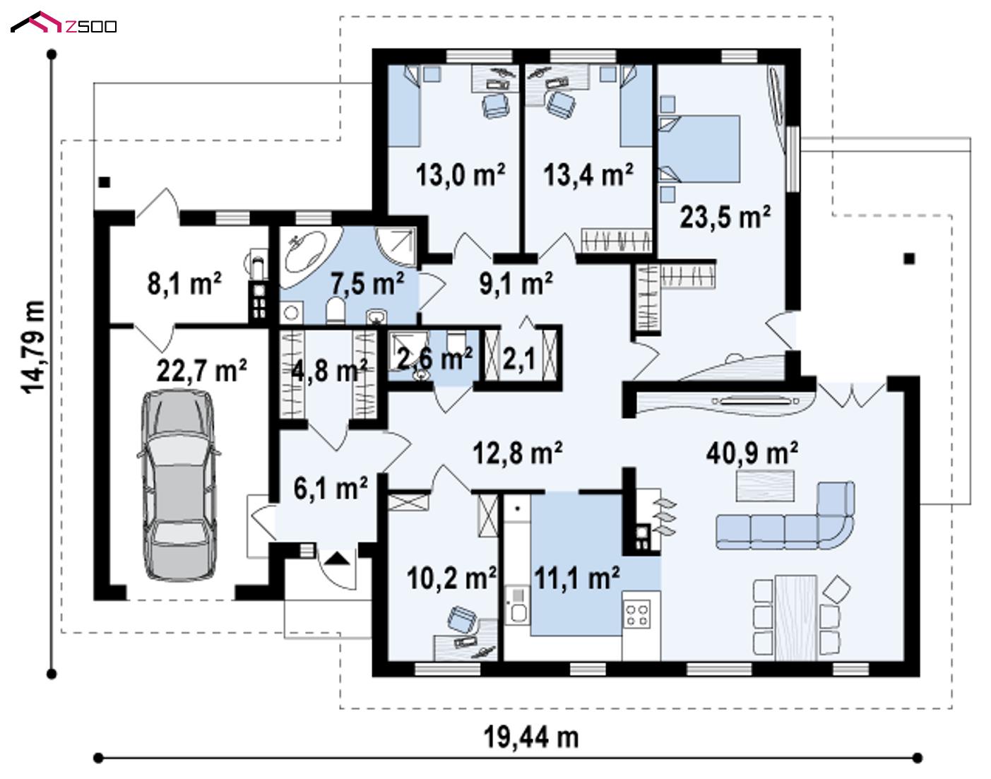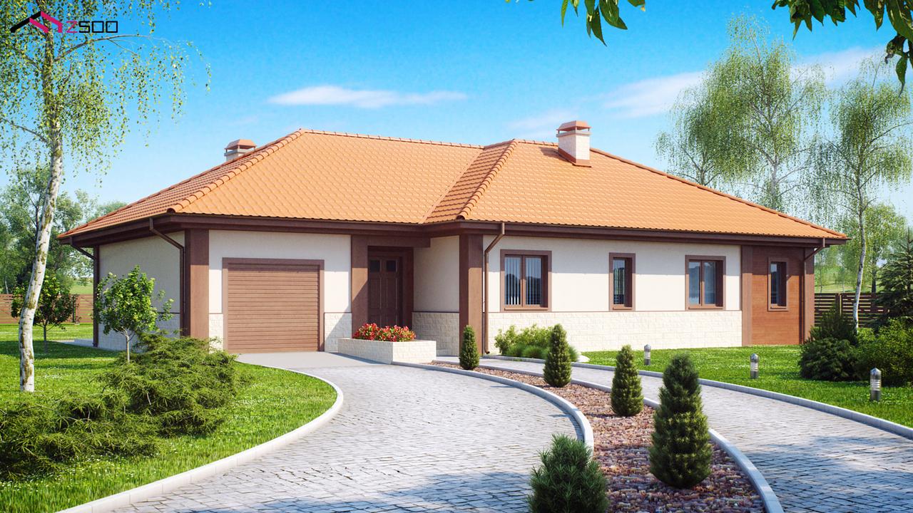 Проект комфортного одноэтажного дома с гаражом, с многоскатной крышей.