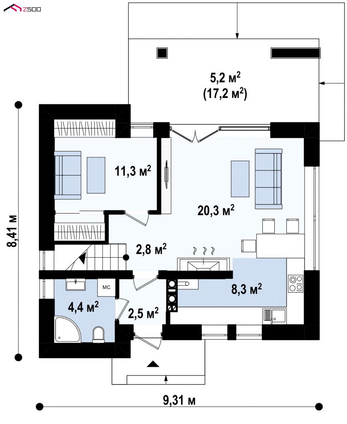 решение позволяют сократить затраты на возведение дома и его содержание. - Открытая форма кухни визуально
