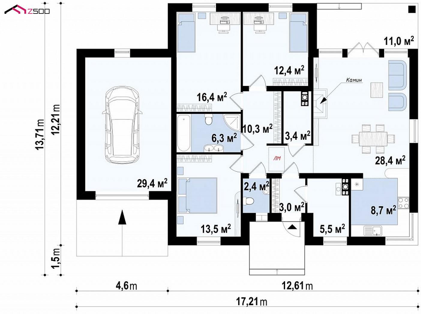 Z24 GL S представляет собой проект одноуровневого дома с тремя спальнями и гаражом на одно авто.