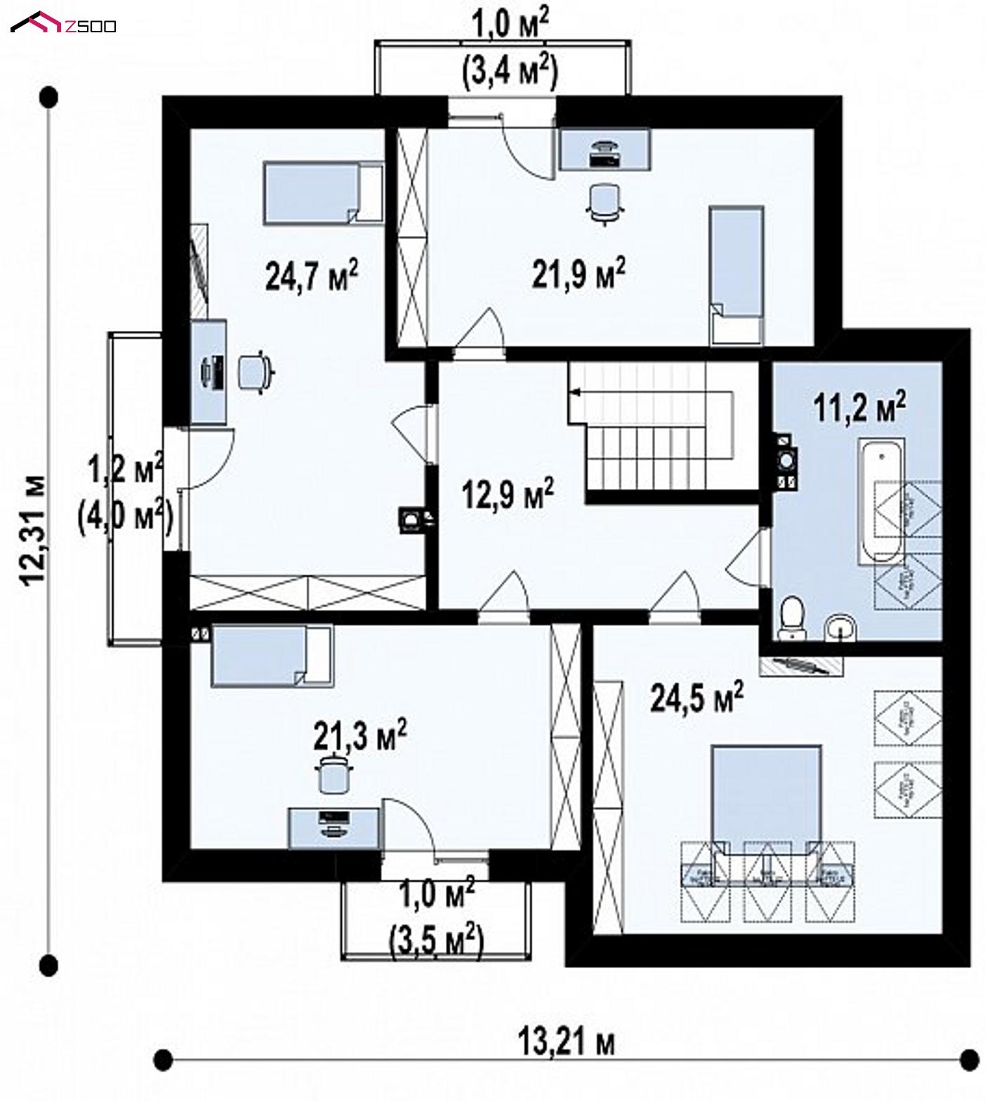 - На мансардном этаже сформирована приватная часть с 4 спальнями и общей ванной комнатой. Из трех спален есть выход на балкон.