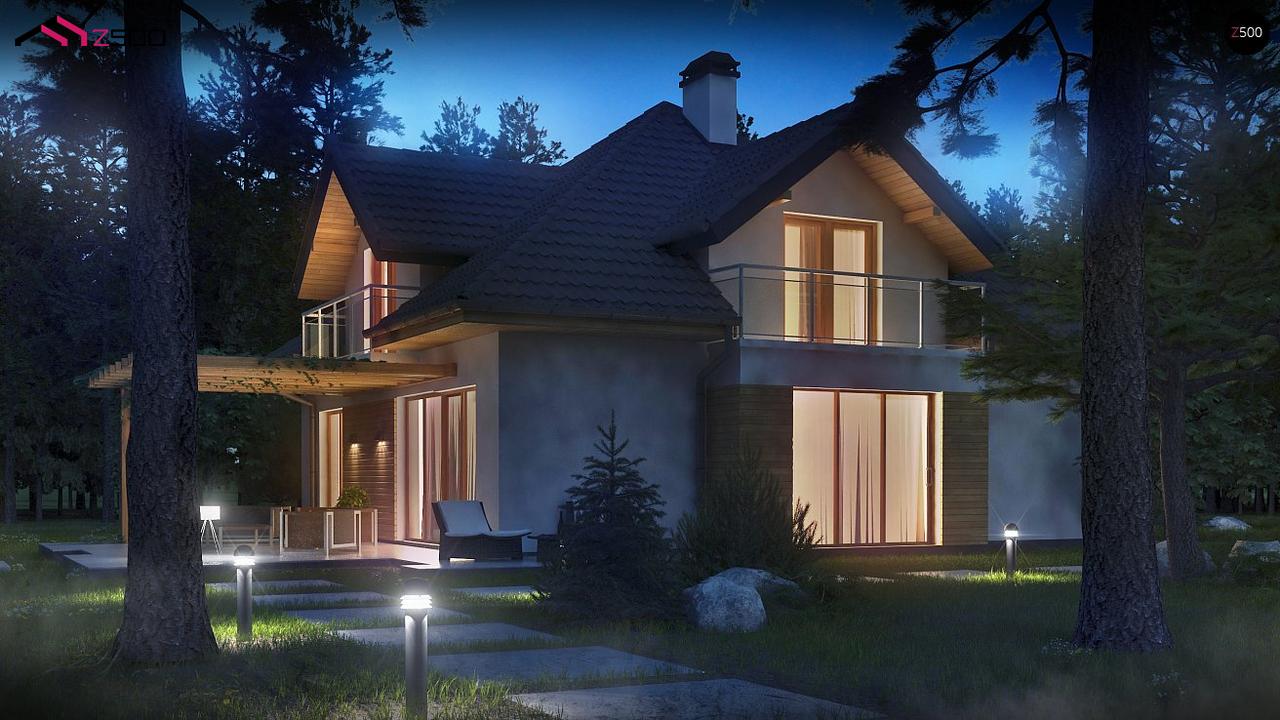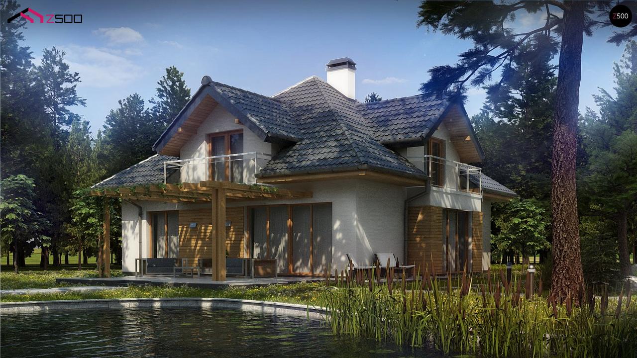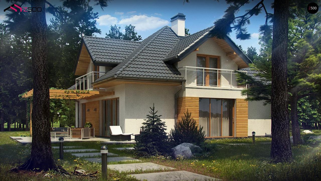 - Сложная архитектура, ломаная конструкция кровли, сдержанное оформление фасадов (белая штукатурка, натуральное светлое дерево), наличие балконов делают дом уникальным и привлекательным для застройщиков разных возрастных групп.