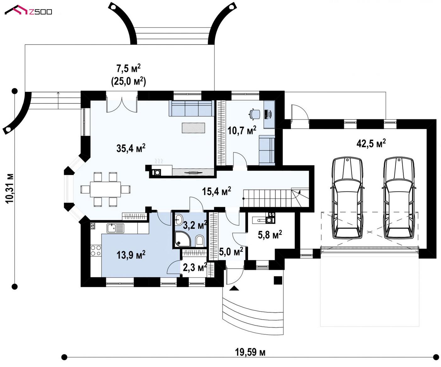 Версия проект Z28 в зеркальном отображении, с гаражом на два авто.