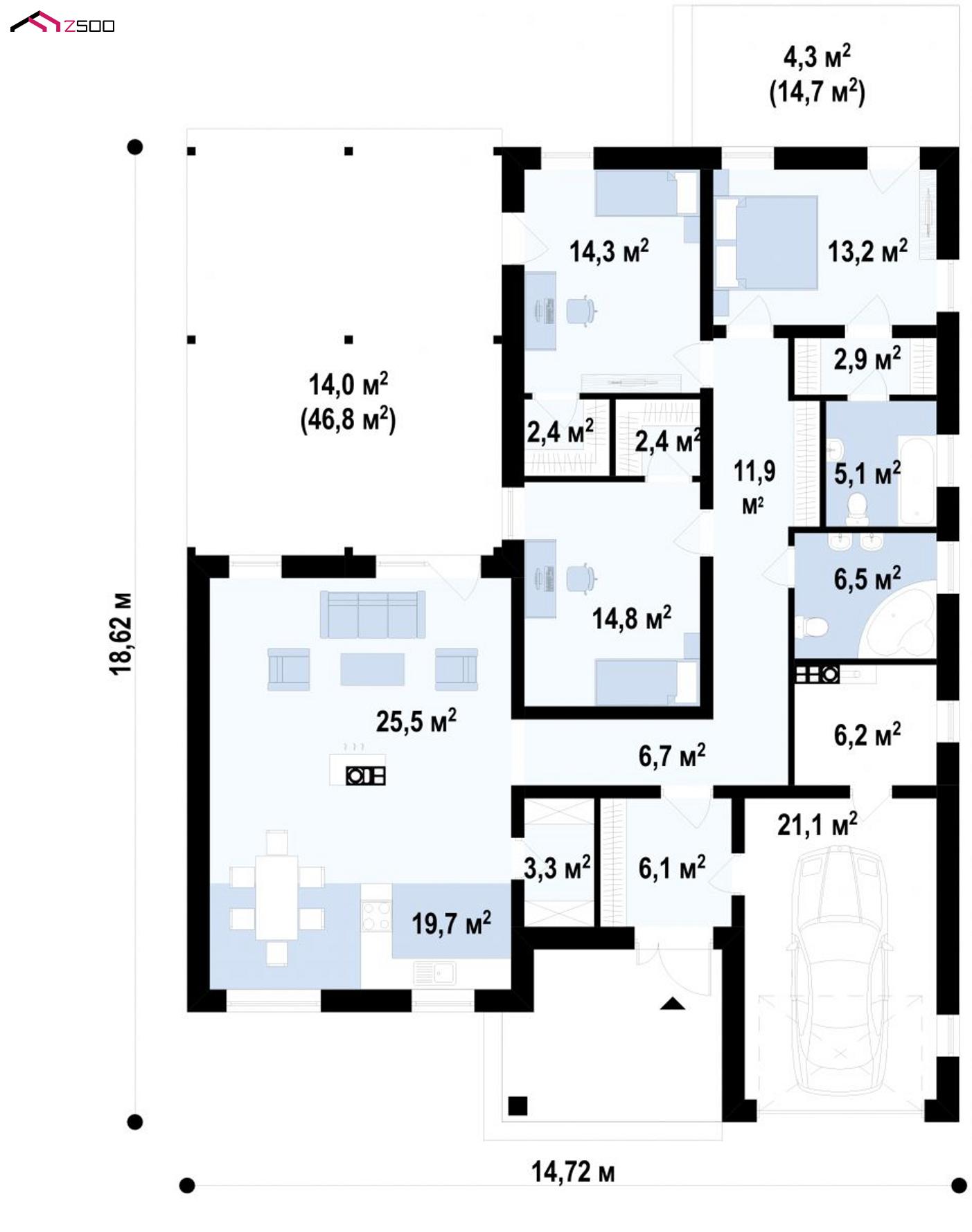Проект одноэтажного дома с выделенной дневной зоной и большой террасой.