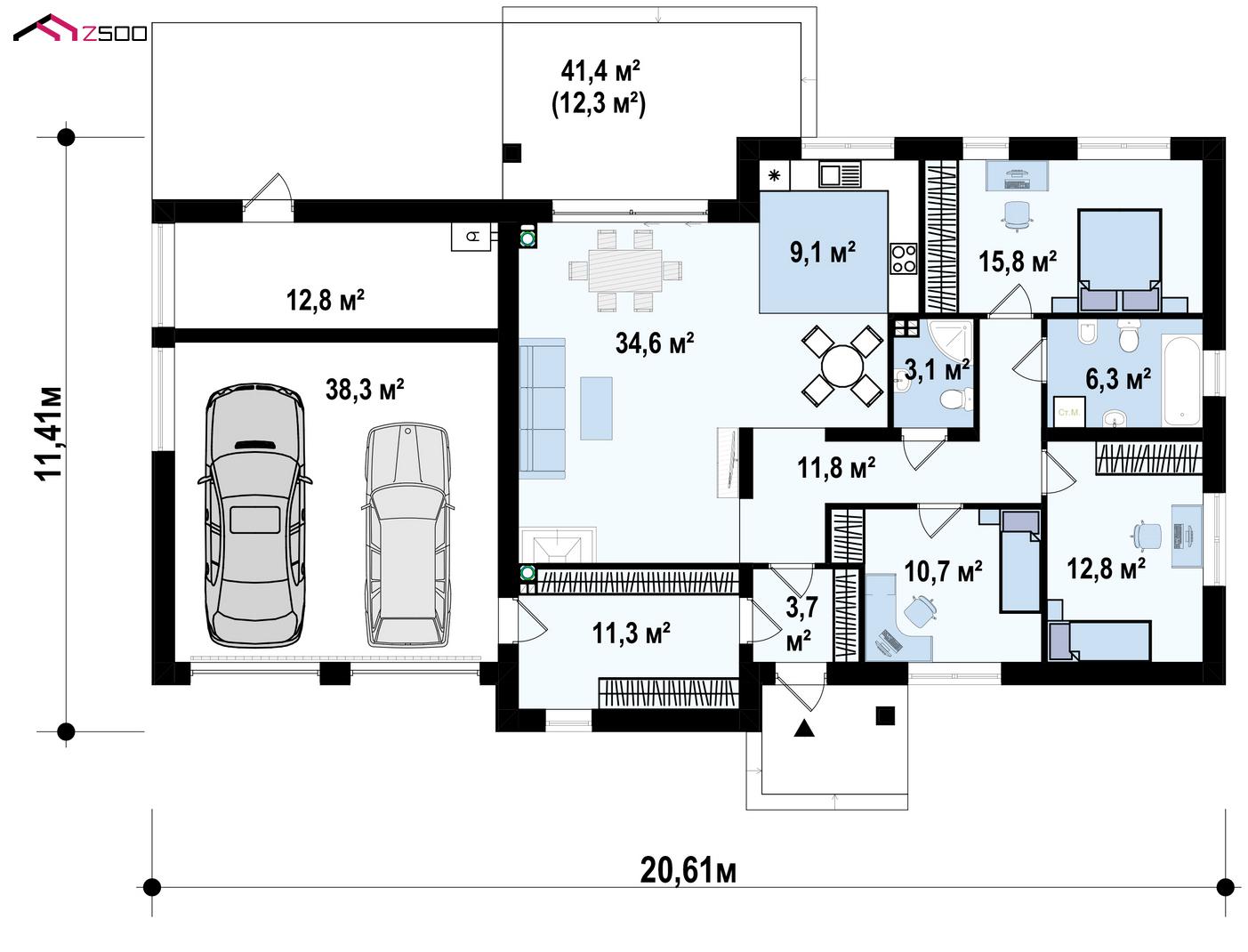 Версия проекта Z287 c большим гаражным помещением.