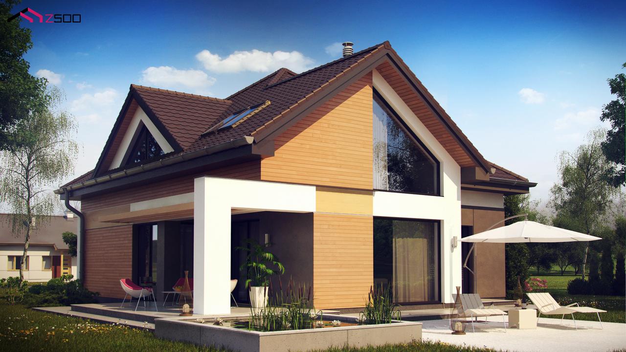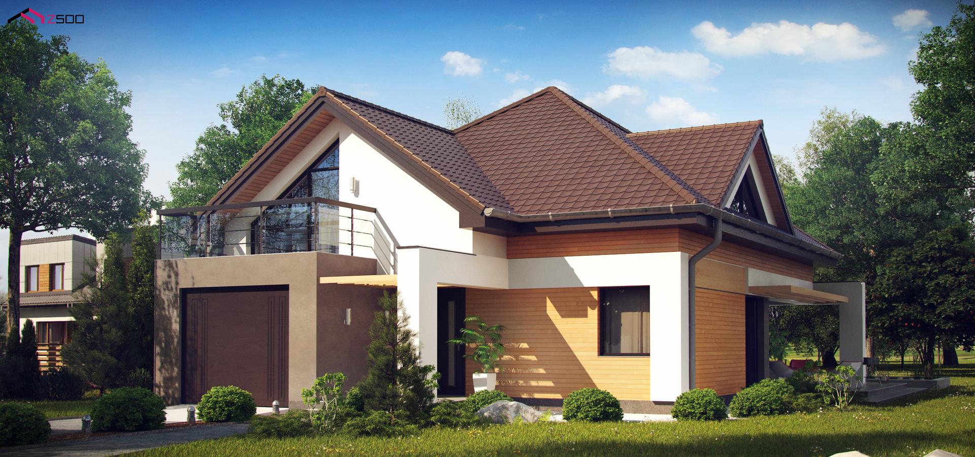 Необычные мансардные окна, фронтальный гараж и современные фасады выделяют этот проект среди остальных.