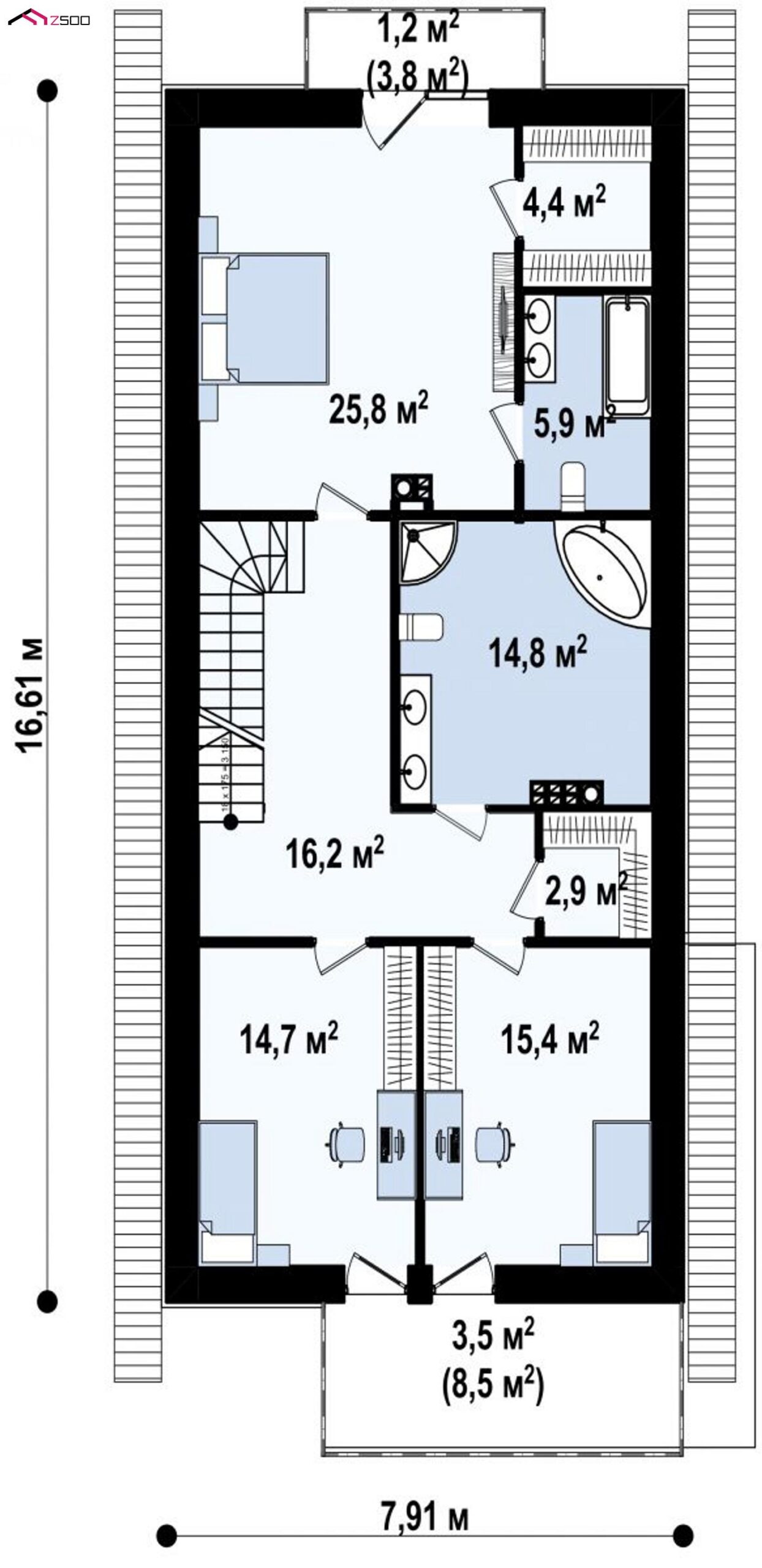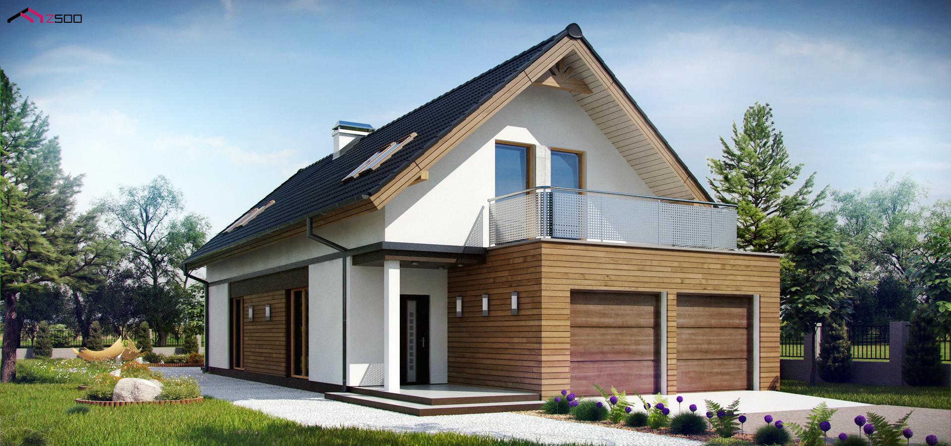Z294 — это практичный и уютный дом простой формы для узкого участка с террасой над гаражом. Благодаря элегантной отделке деревянными панелями, выступающему