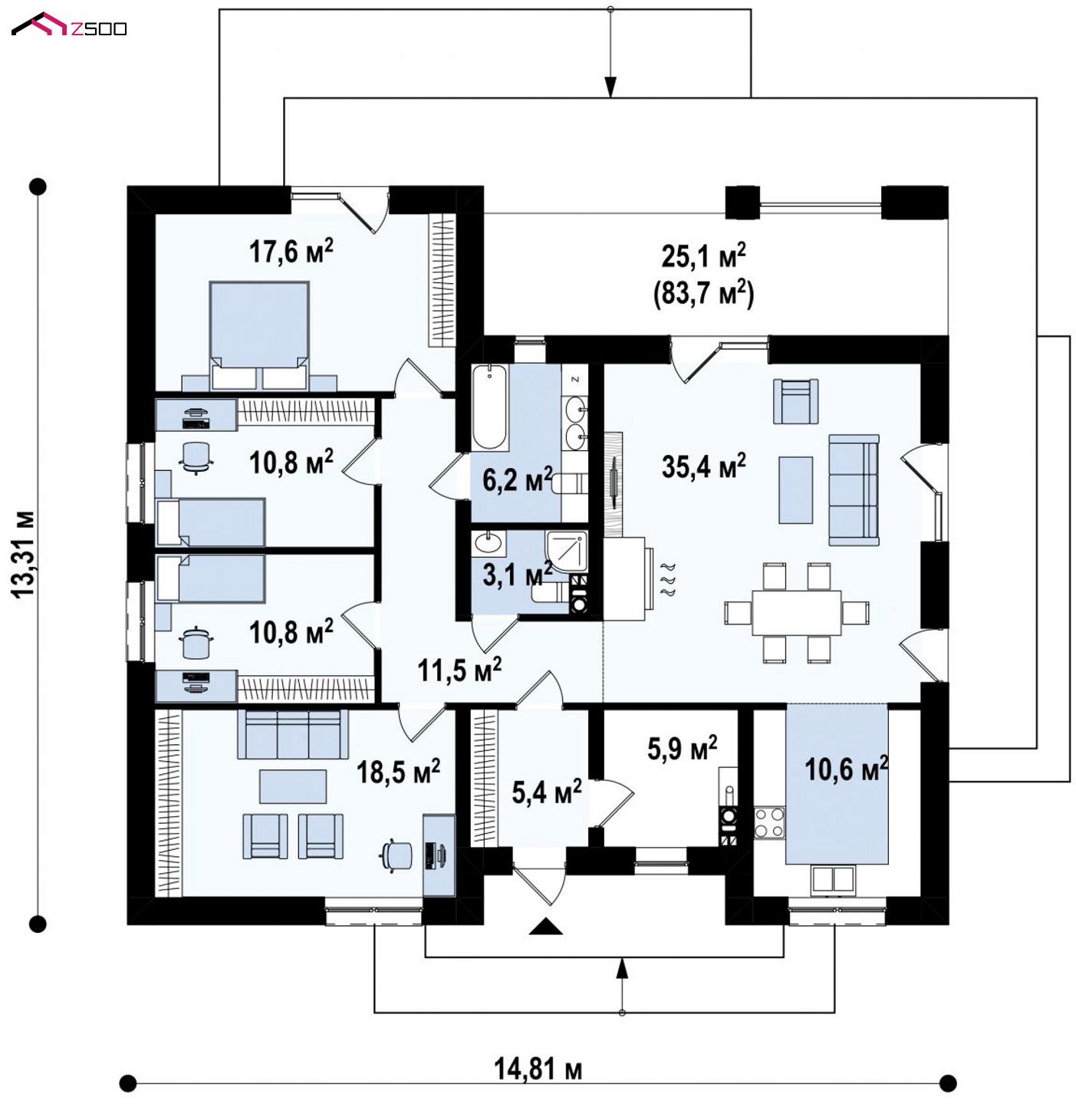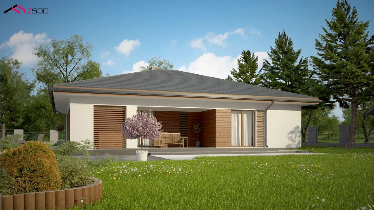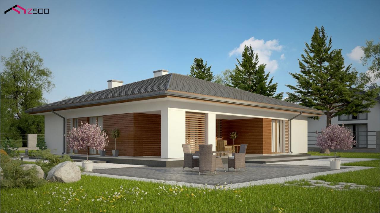 Z321 S представляет собой одноэтажный дом с комфортной крытой террасой адаптированный под строительство в сейсмических районах.