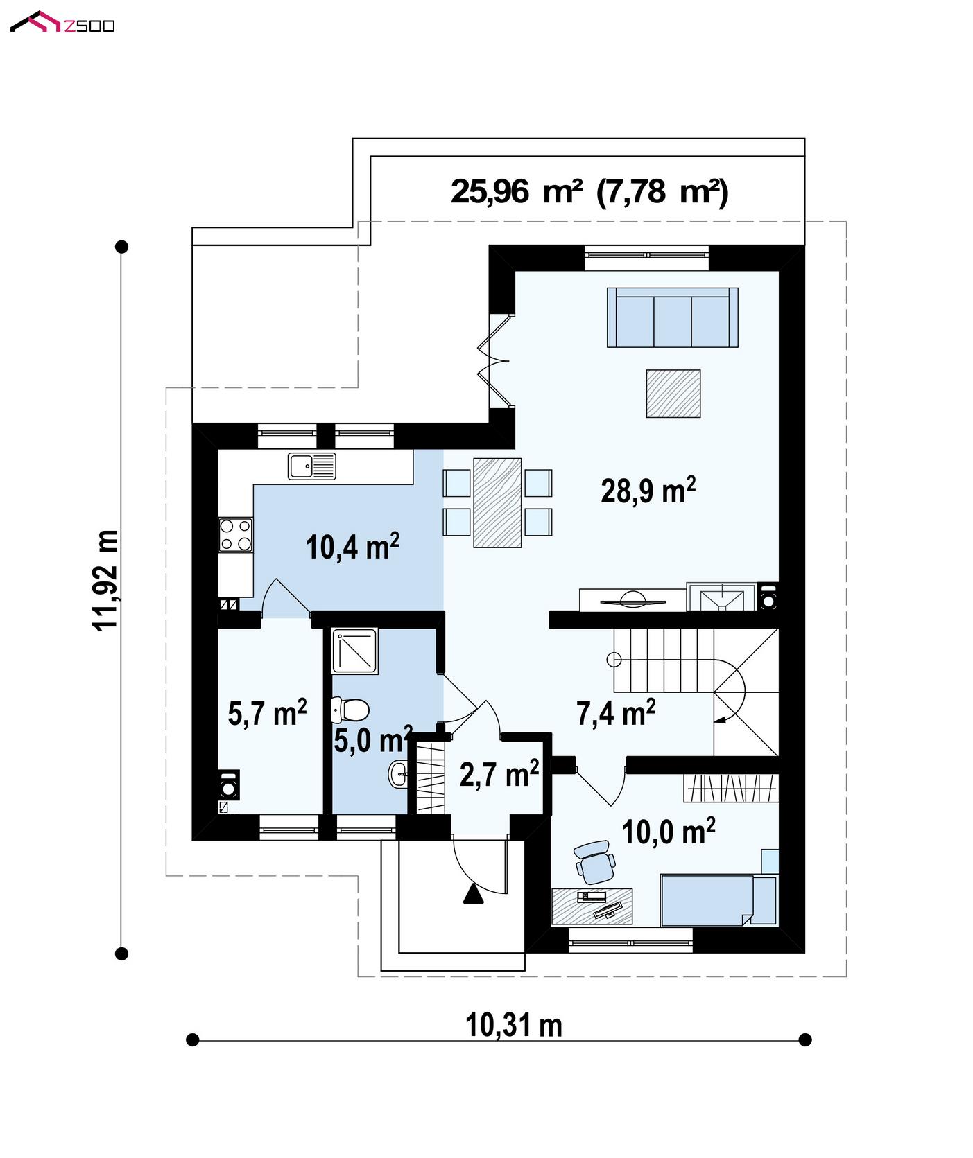 увеличивает пространство дневной зоны. При необходимости ее можно отделить частично или полностью стенной перегородкой.