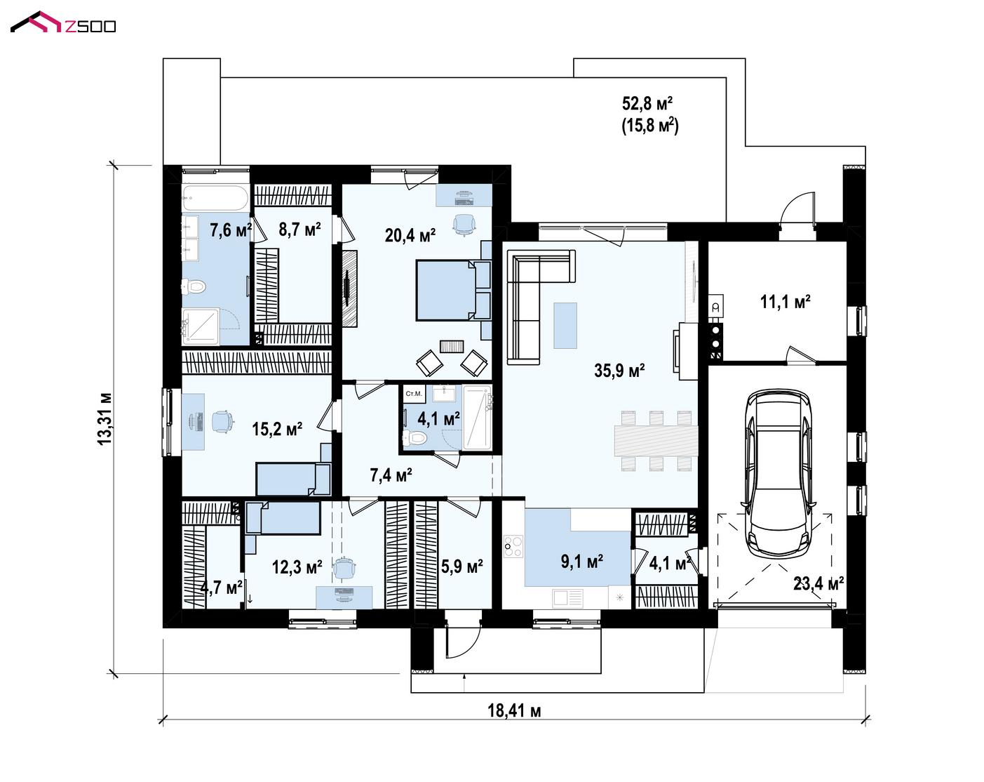 Вариант одноэтажного дома Z387 с измененной планировкой