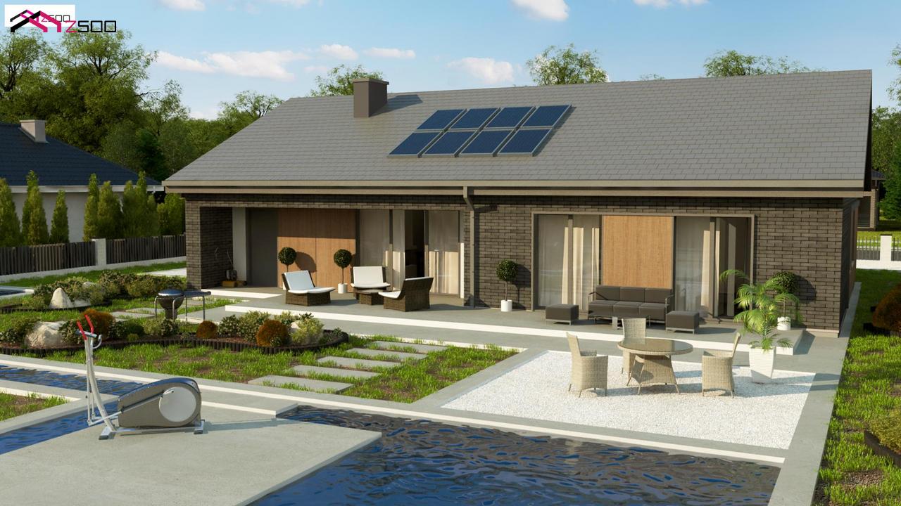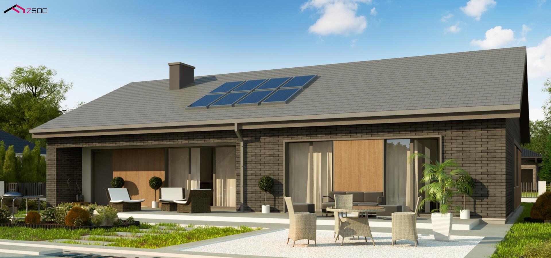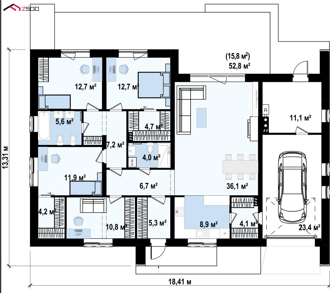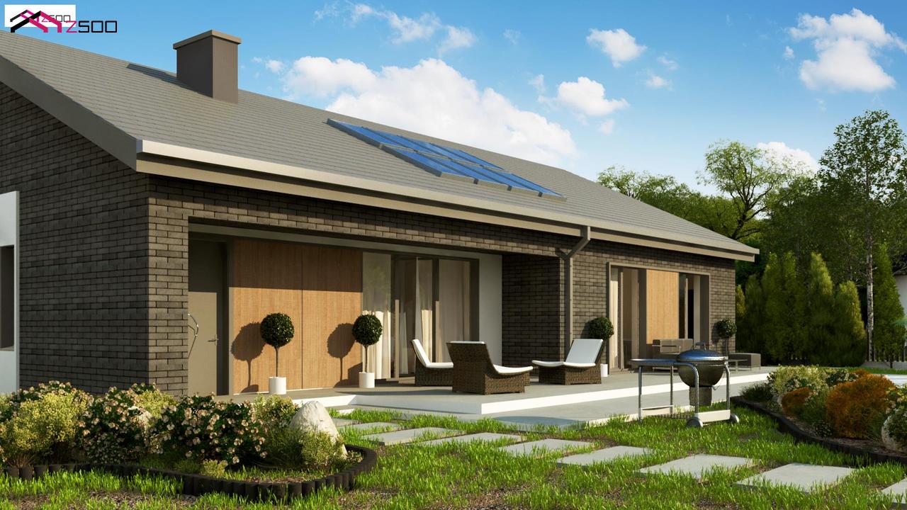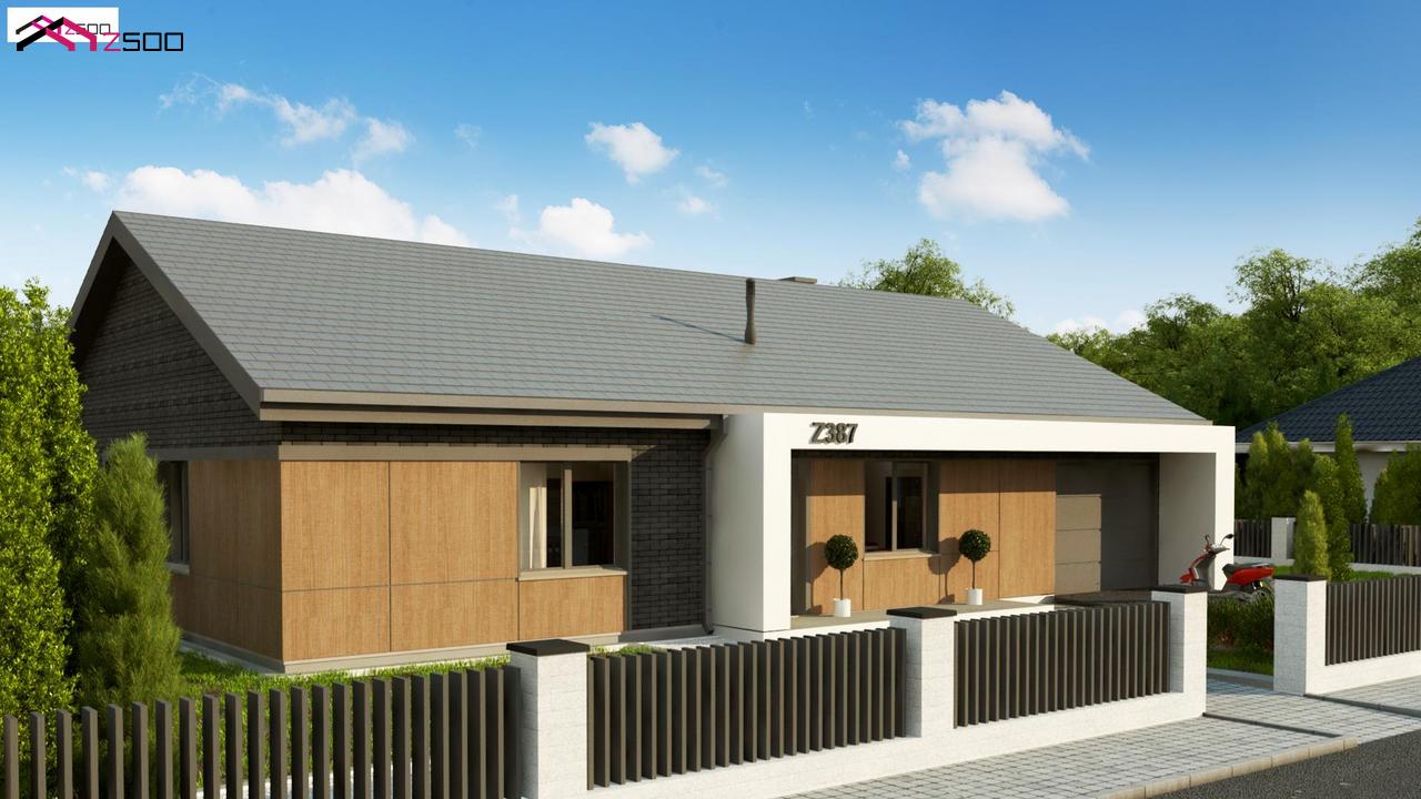 Z387 представляет собой одноэтажный дом с 4 спальнями, гаражом и 2-х скатной крышей.