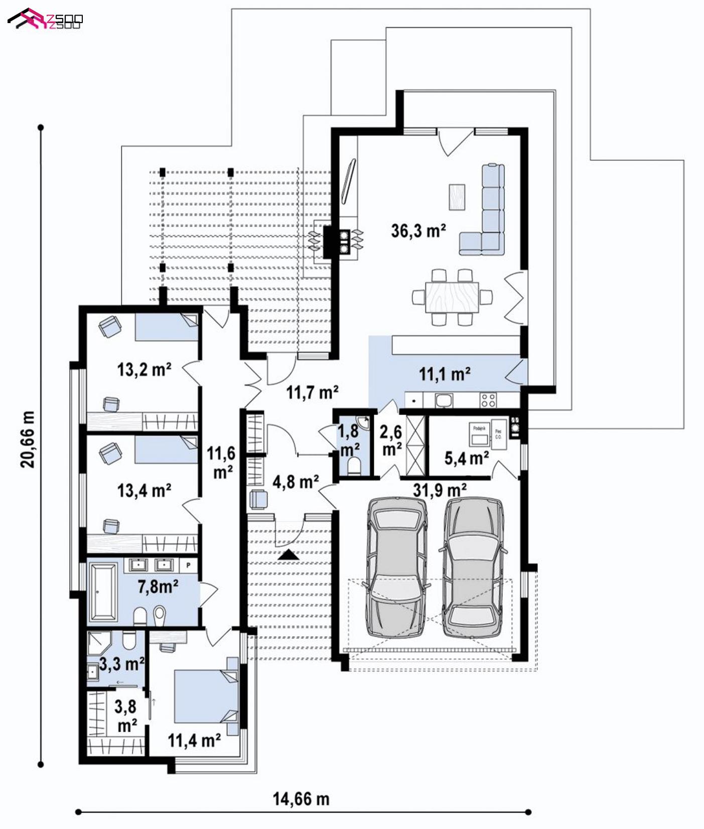Z388 представляет собой проект современного дома с четким разделением дома на две части: дневную и ночную.