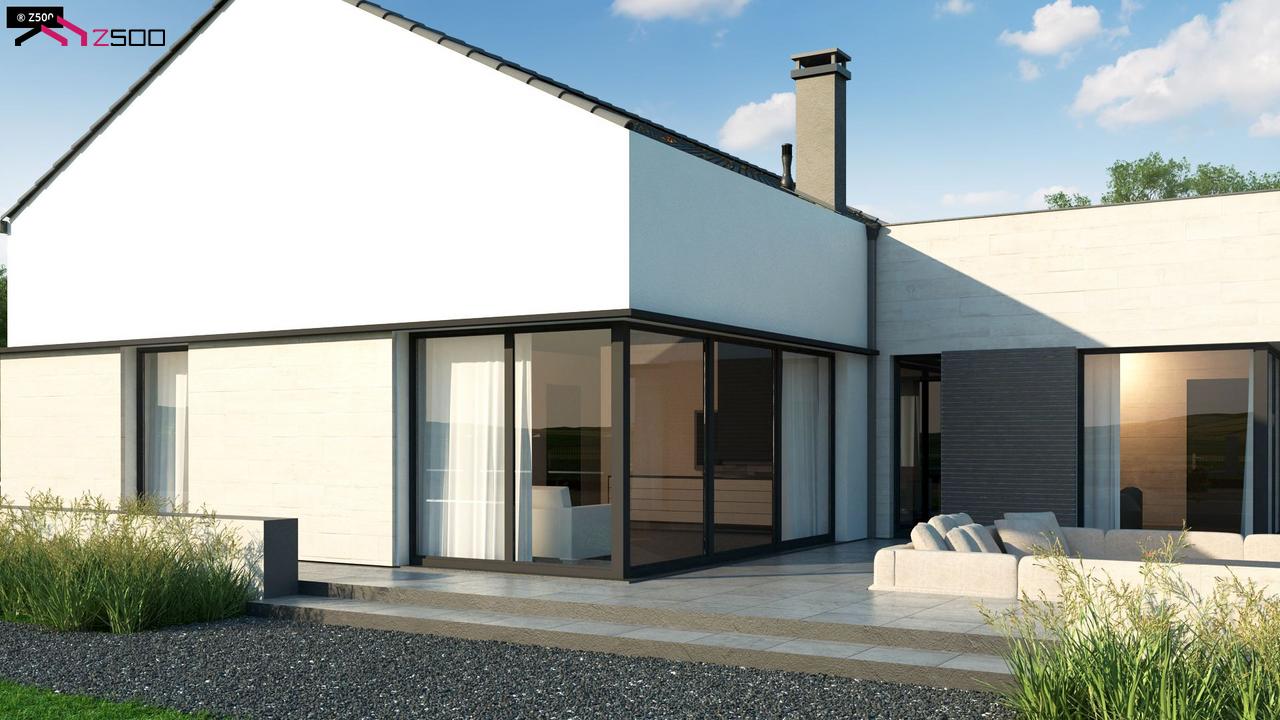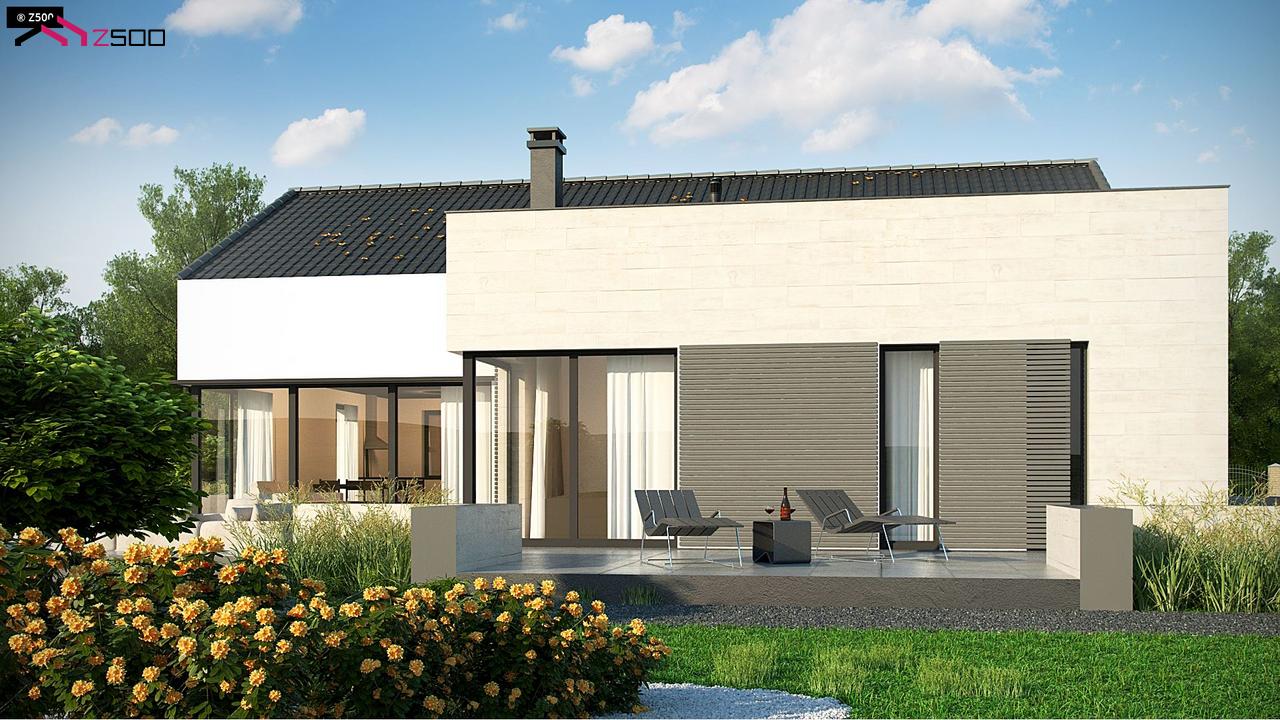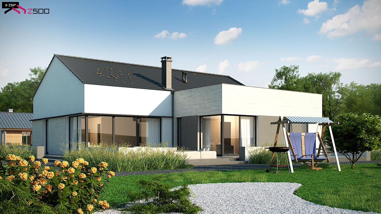 Проект одноэтажного дома Z390 с гаражом на 1 машину и красивым белым фасадом