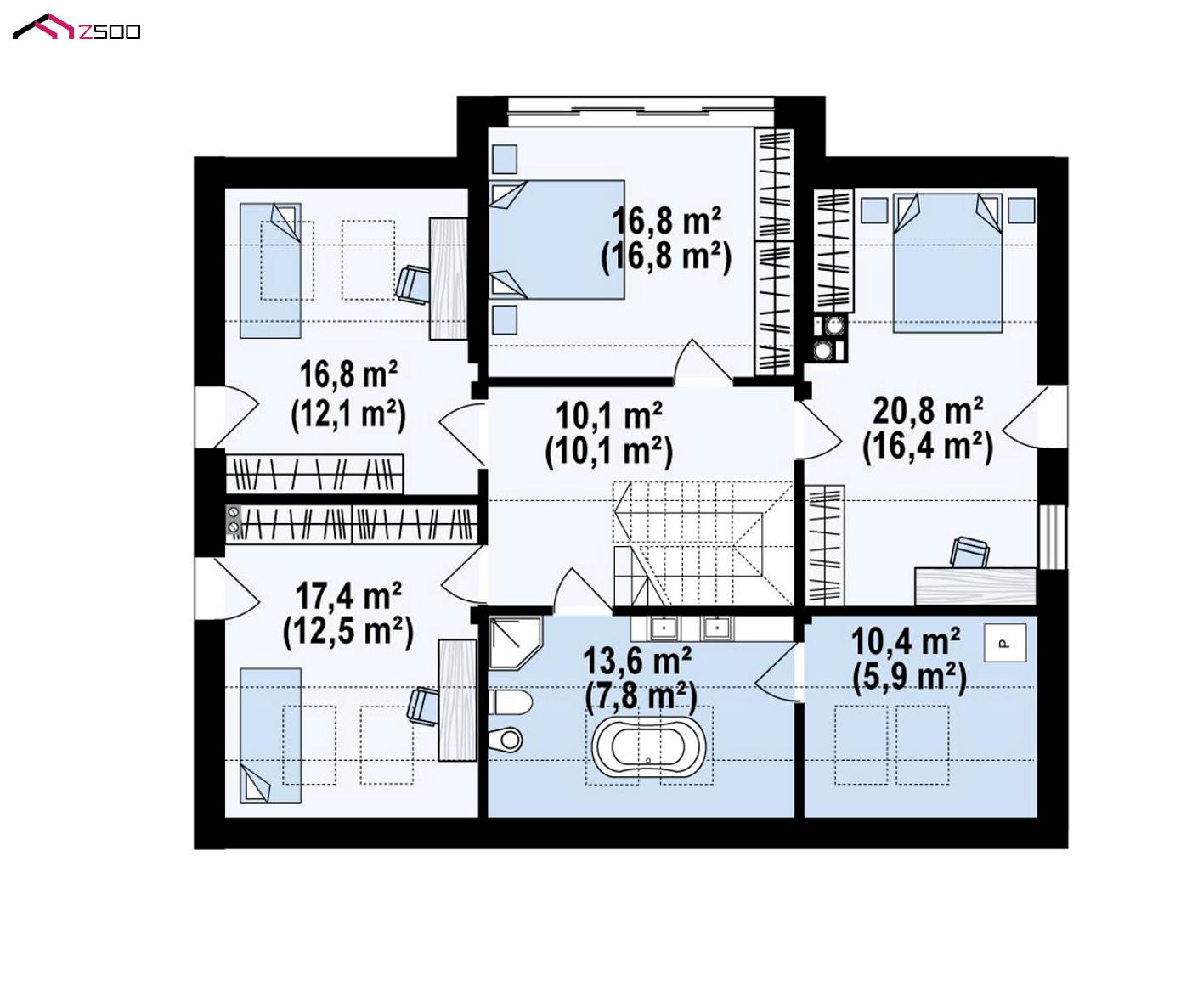 • Второй этаж — это жилая мансарда, в которой расместились четыре больших спальные комнаты и общей большой ванной, в которой предусмотрена прачечная.