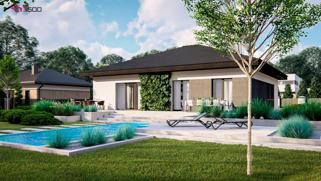 Функциональный одноэтажный дом с гаражом на одну машину, расположенный в центральной части переднего фасада.