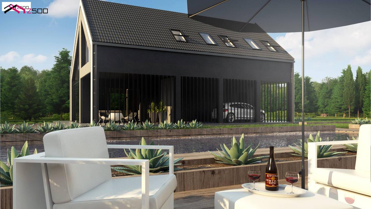 • Проектом предусмотрена терраса и навес для двух автомобилей.