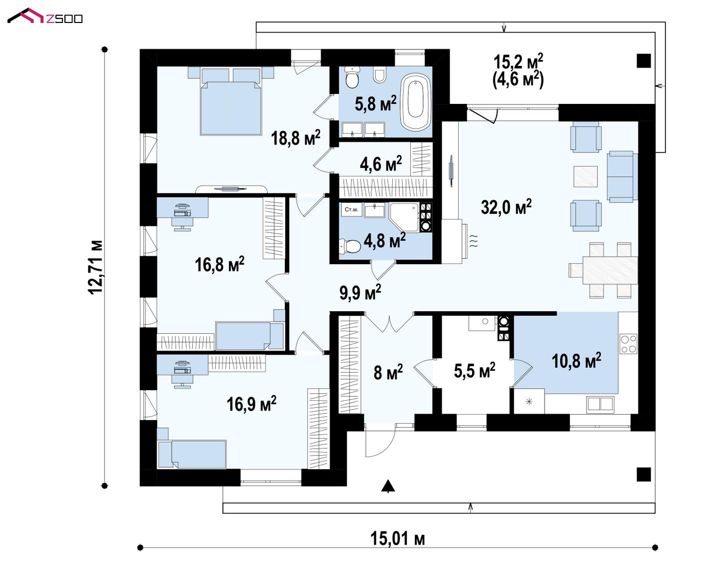 Вариант одноэтажного дома Z459 без гаража с измененной планировкой