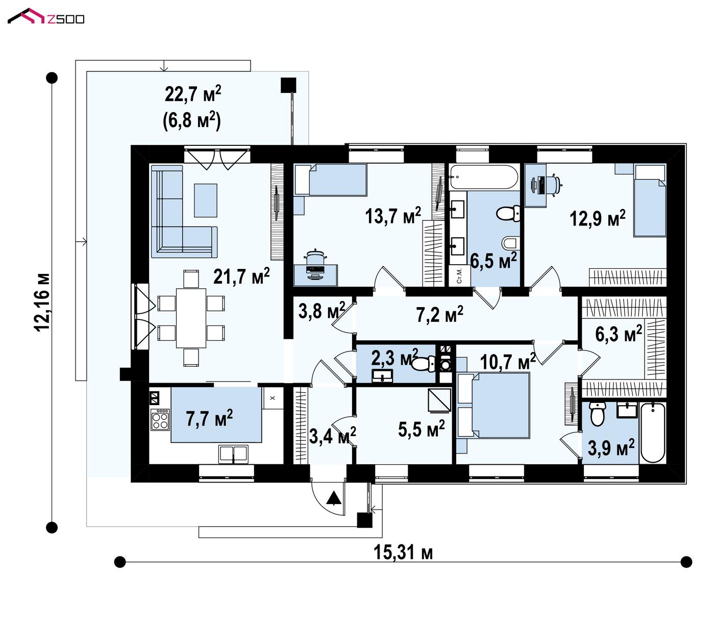 Z473 v1 – вариант одноэтажного дома Z473 с 3 спальнями.