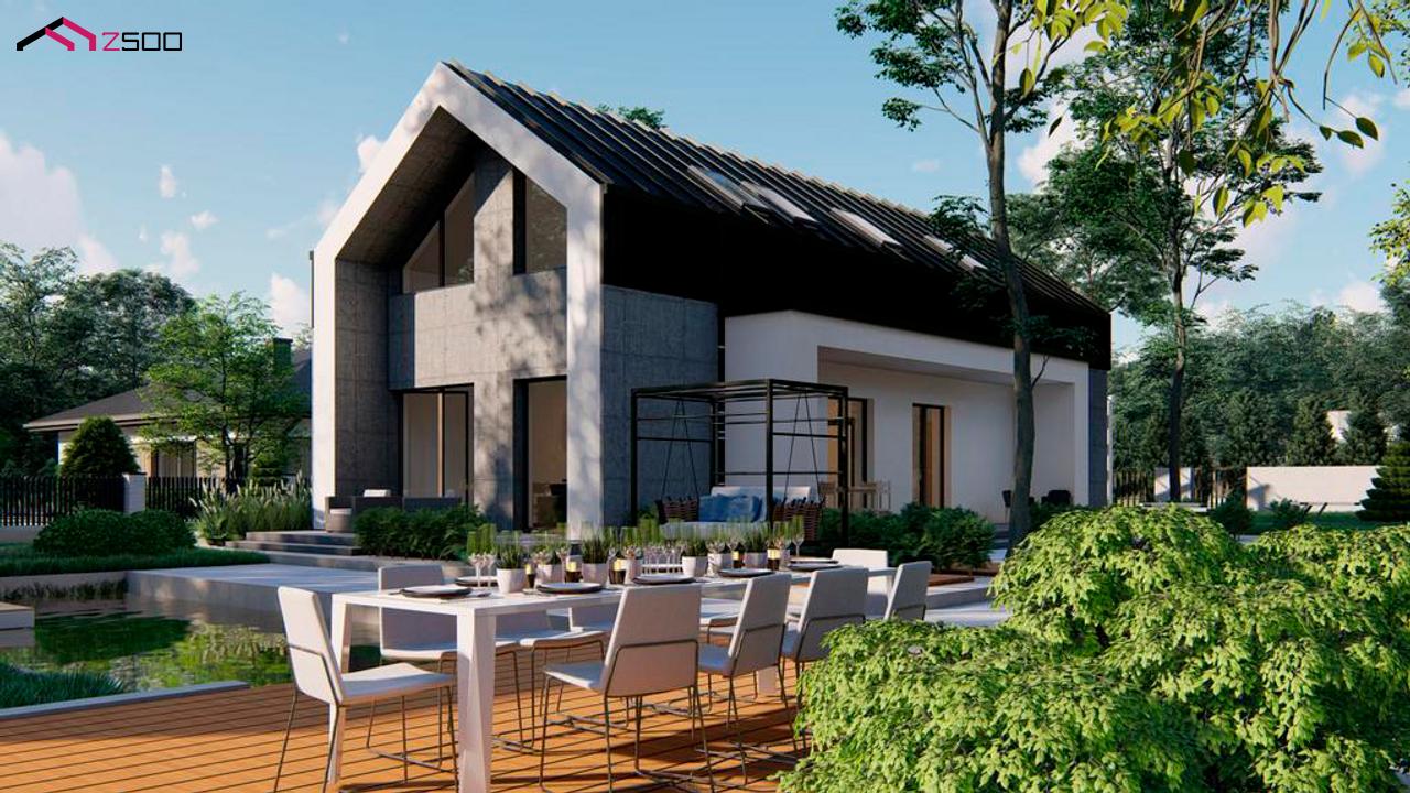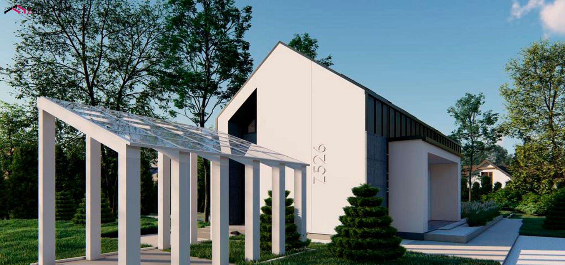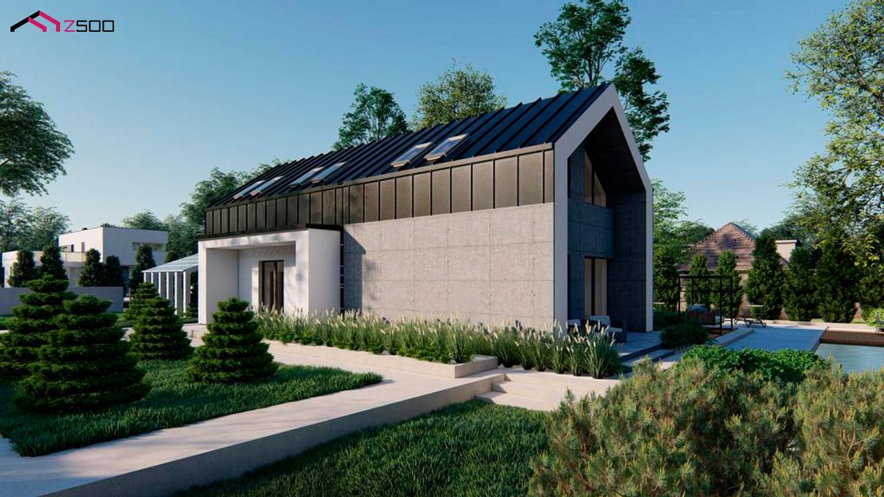Z526 представляет собой проект дома для узкого участка с мансардой, большой гостиной и боковой террасой.