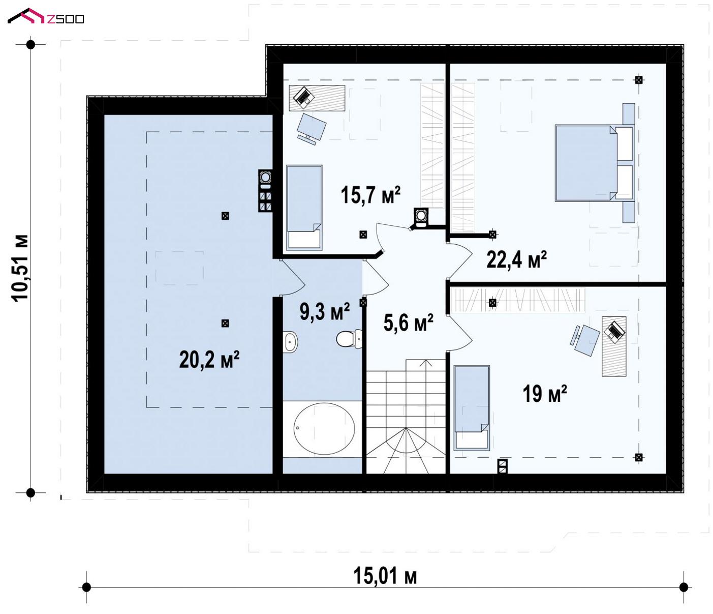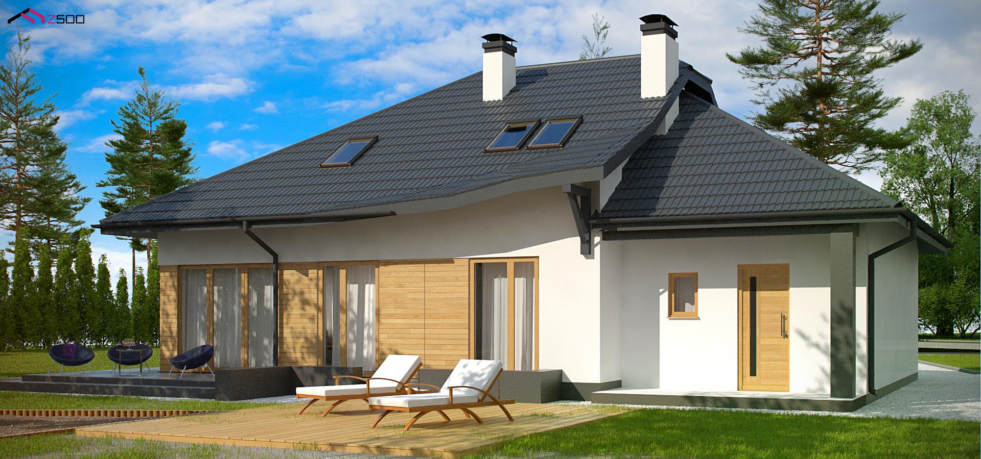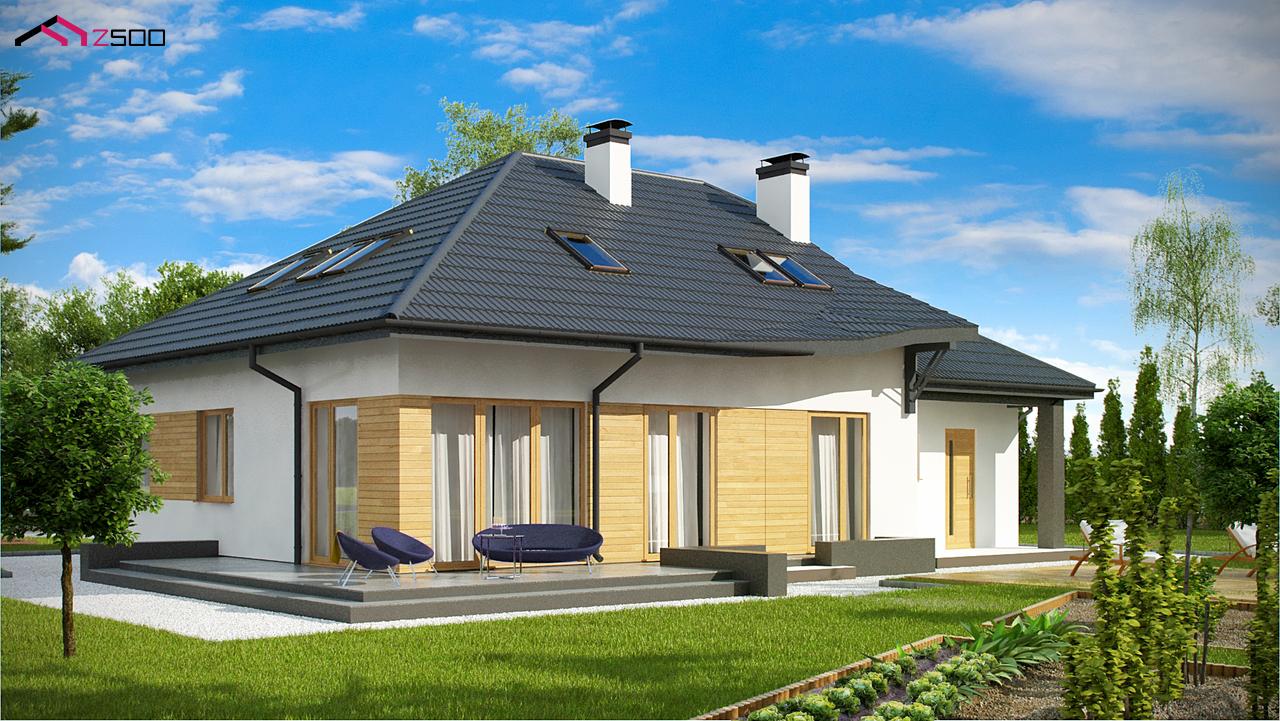 Разработка Z56 A представляет современную версию проекта Z56. Летящая форма крыши стала настоящей изюминкой дома. В новой разработке она спроектирована тёмно–серой, что выгодно выделяет её на фоне светлого фасада. На первом уровне спланирована дневная зона открытого типа (к кухне примыкает небольшая кладовая). Также здесь есть дополнительная комната, расположенная рядом с гостиной. Три спальни спроектированы на втором уровне. Для всех комнат предусмотрена общая ванная, из которой можно попасть в дополнительное помещение, устроенное на площади над гаражом (его назначение оставлено свободным).
