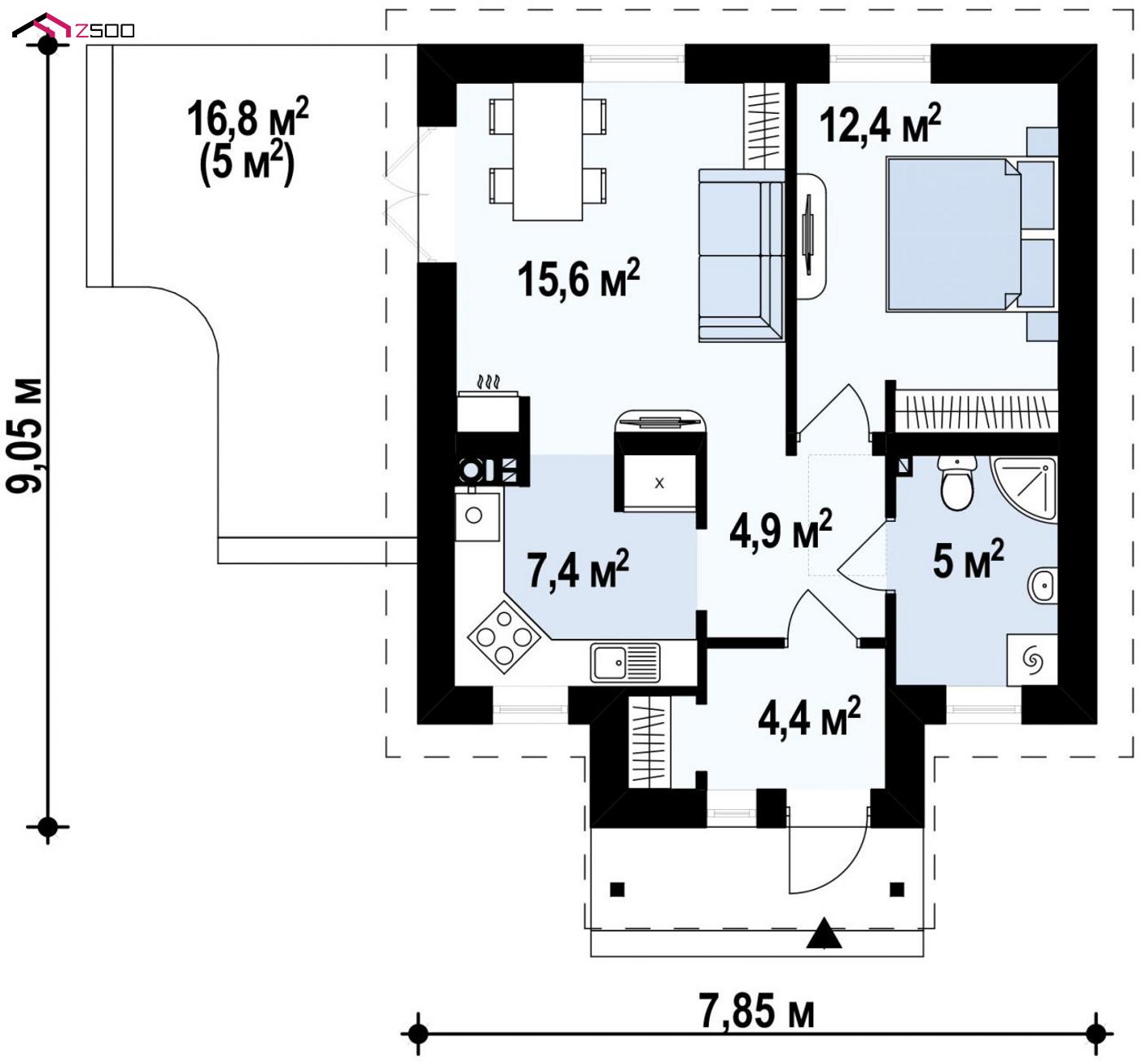 Проект маленького уютного дома с функциональной планировкой. Оснащен всем необходимым для постоянного проживания.