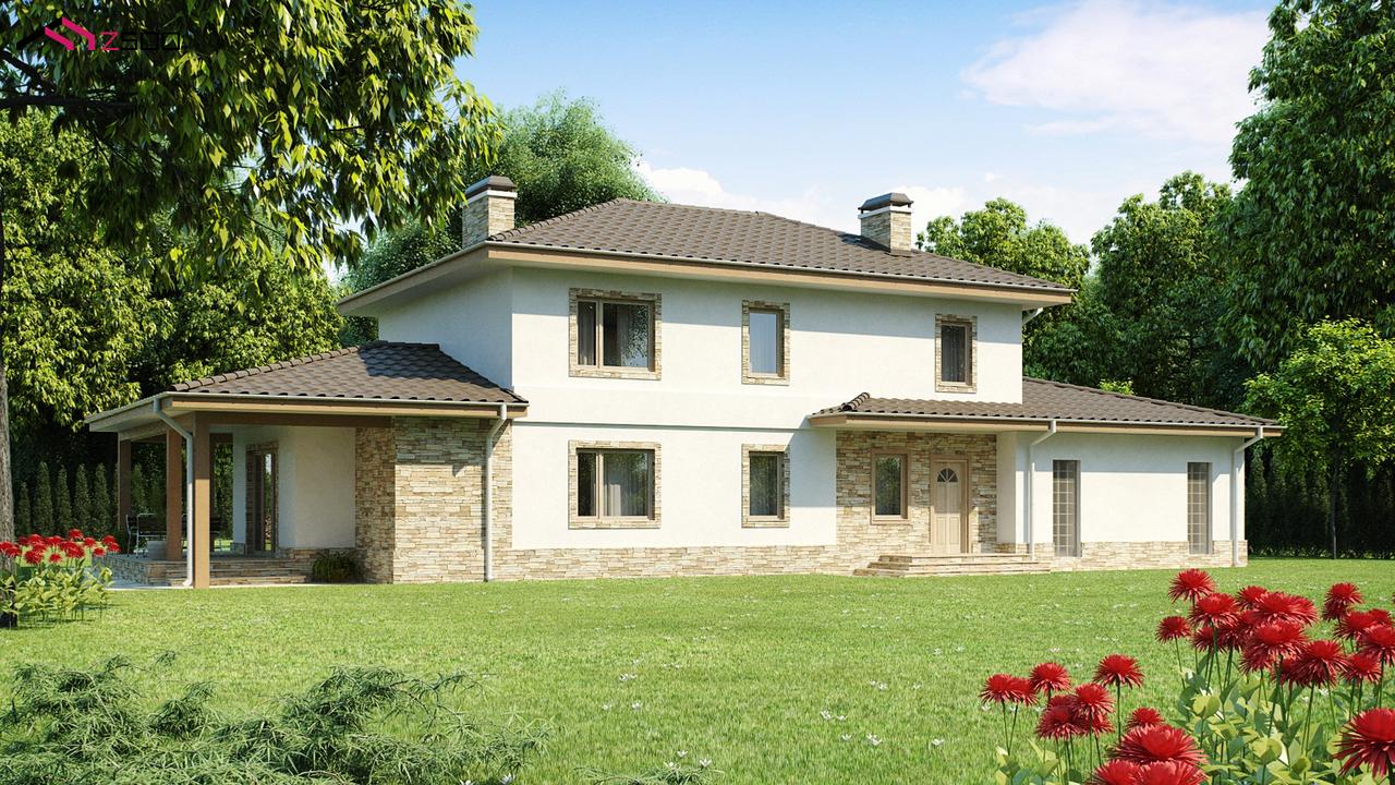 итальянская двухэтажная вилла с крытой боковой террасой и большим гаражом. Проект