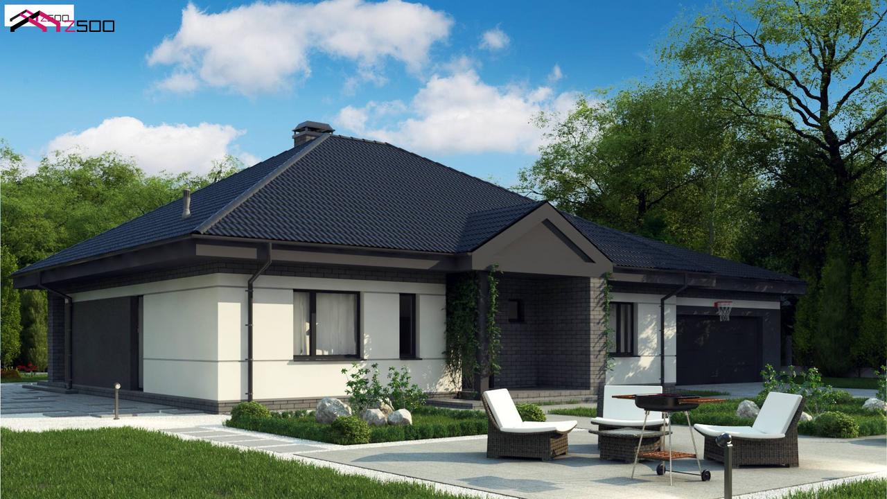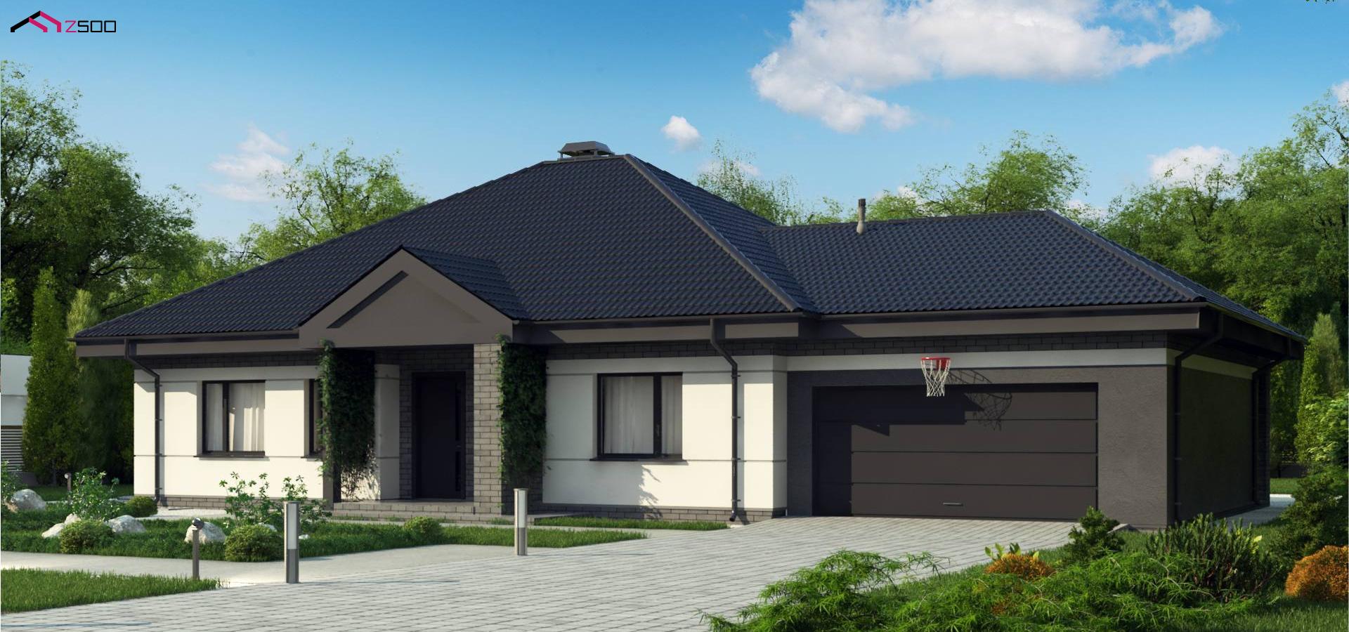 Z86 A представляет собой проект одноэтажного дома с четырехскатной кровлей и гаражом на два автомобиля.