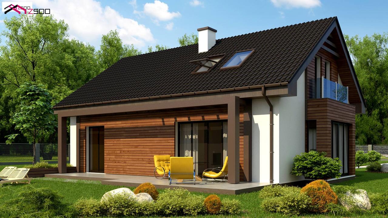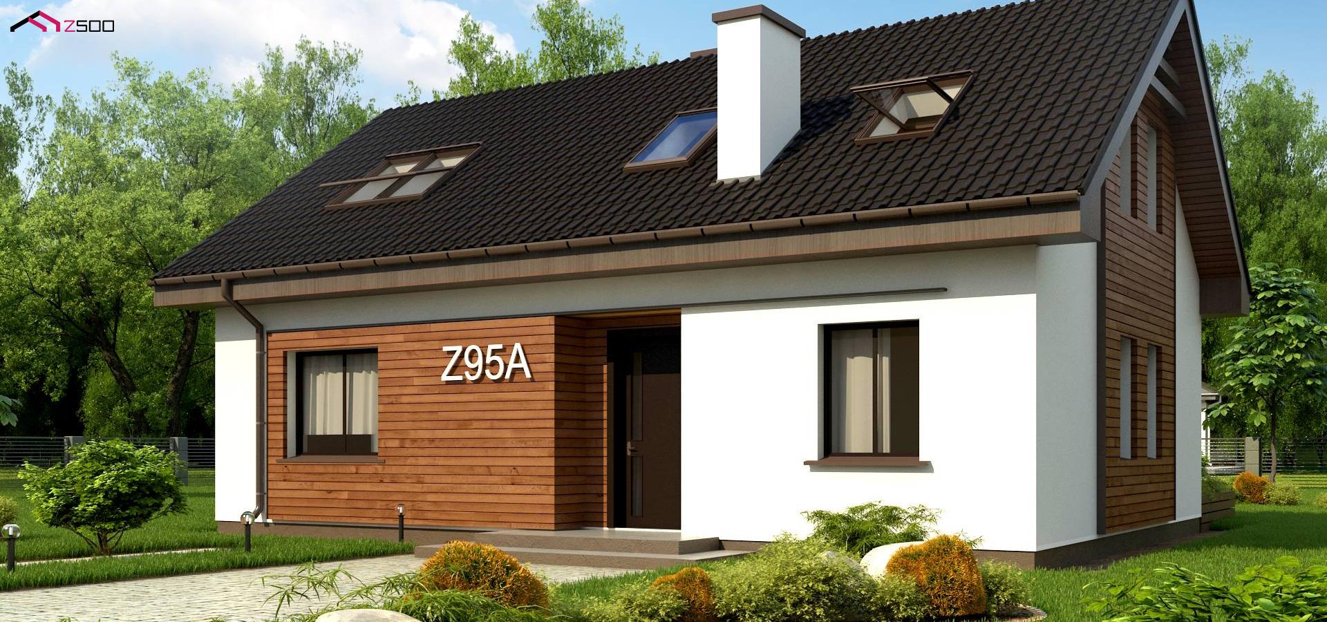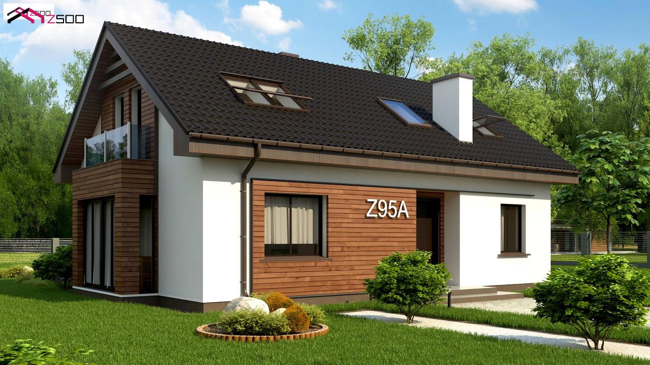 Z95 A – это мансардный дом, с деревом на фасадах и кабинетом на первом этаже. В наш каталог готовых проектов коттеджей данный проект внесен как проект компактного дома, но вполне пригоден для комфортного проживания в нем даже большой семьи.