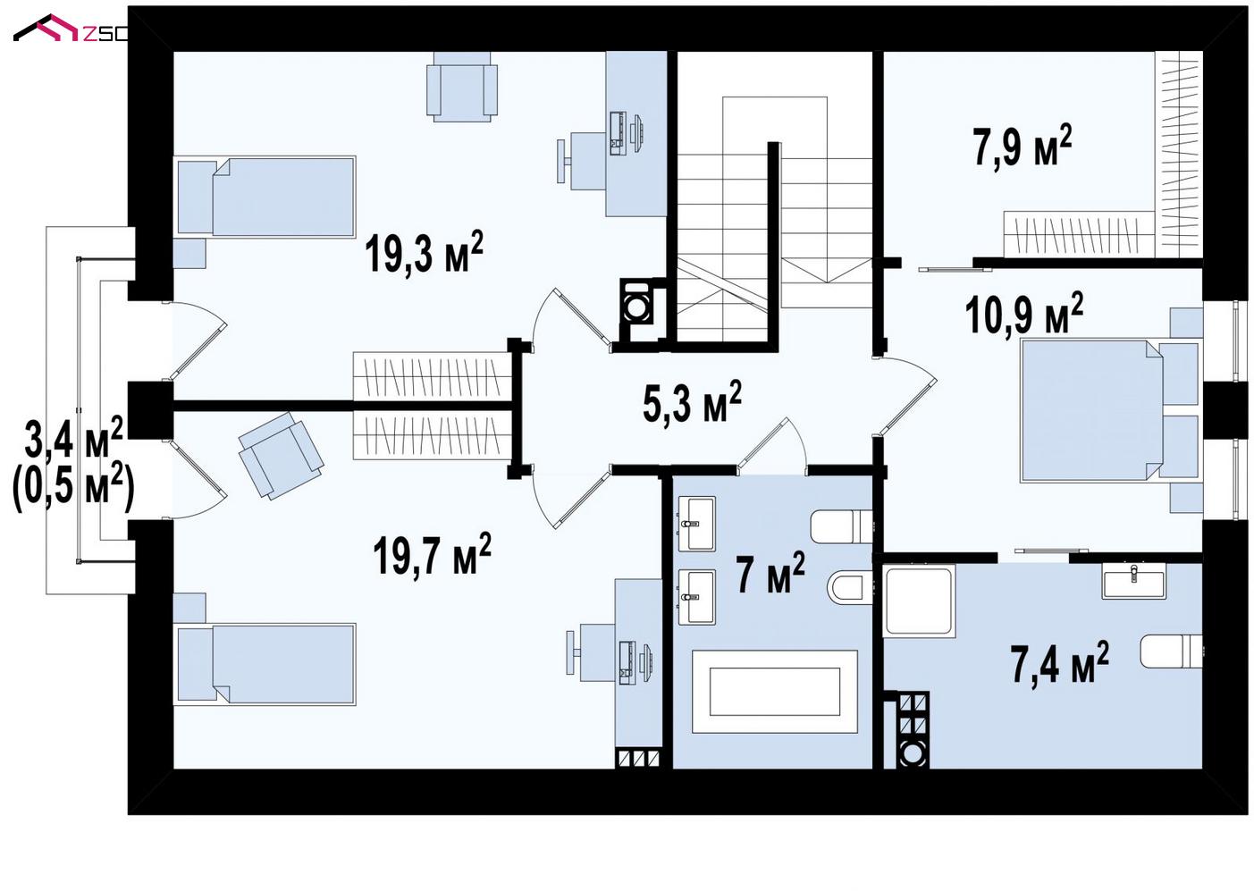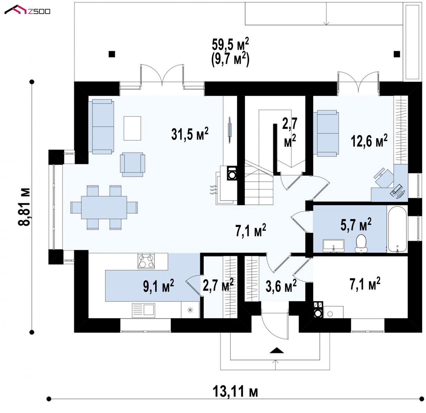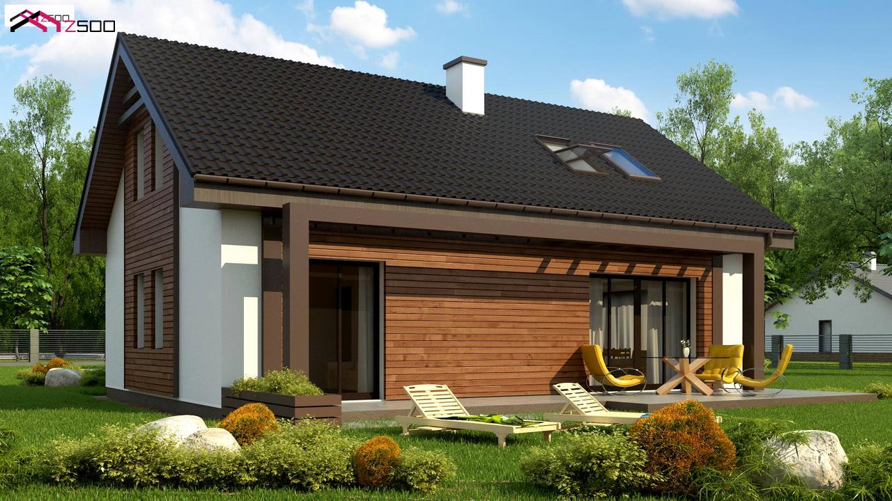 Z95 A – это мансардный дом, с деревом на фасадах и кабинетом на первом этаже. В наш каталог готовых проектов коттеджей данный проект внесен как проект компактного дома, но вполне пригоден для комфортного проживания в нем даже большой семьи.