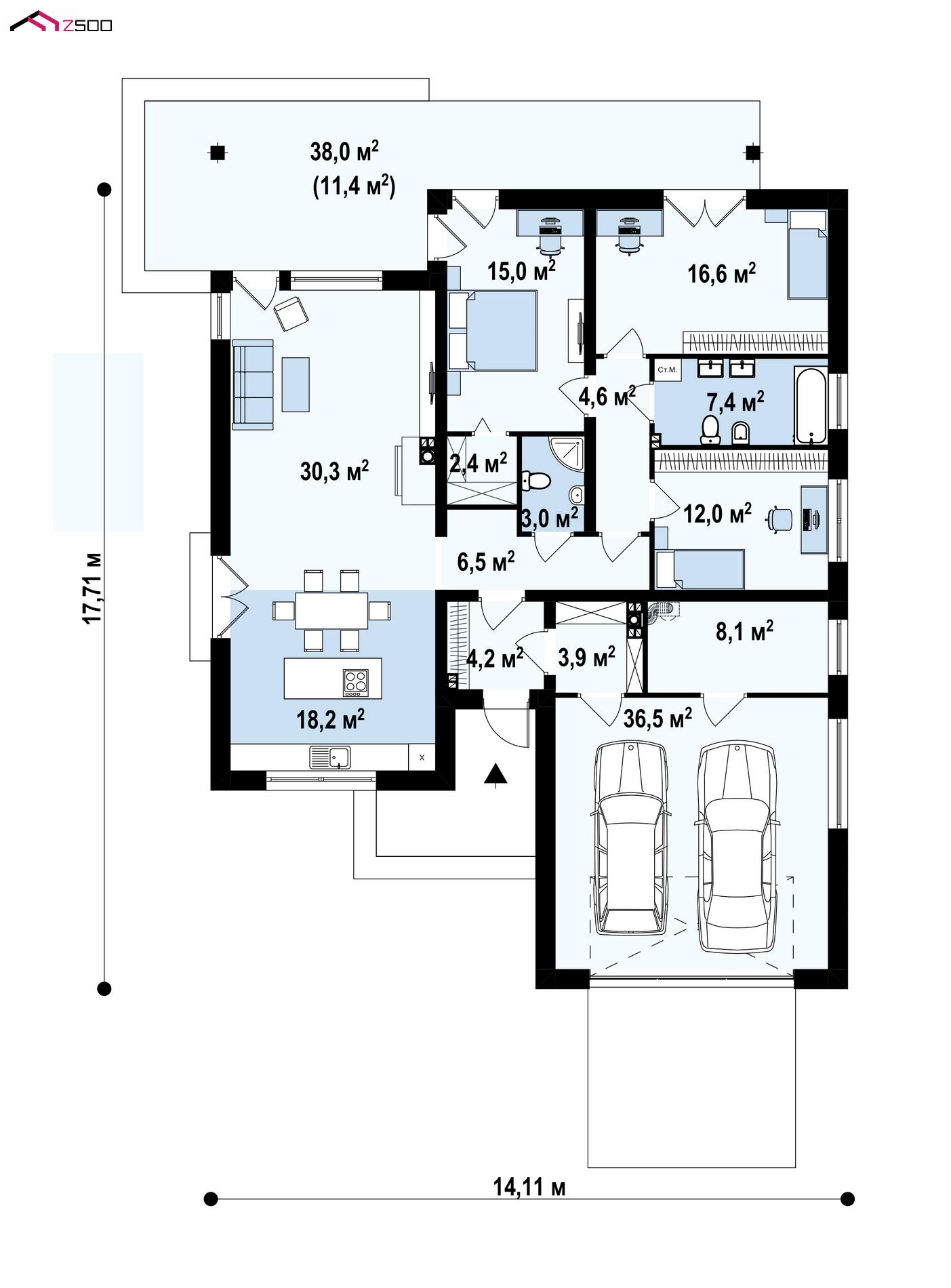 Проект Z96 представляет собой одноэтажный дом с фронтальным