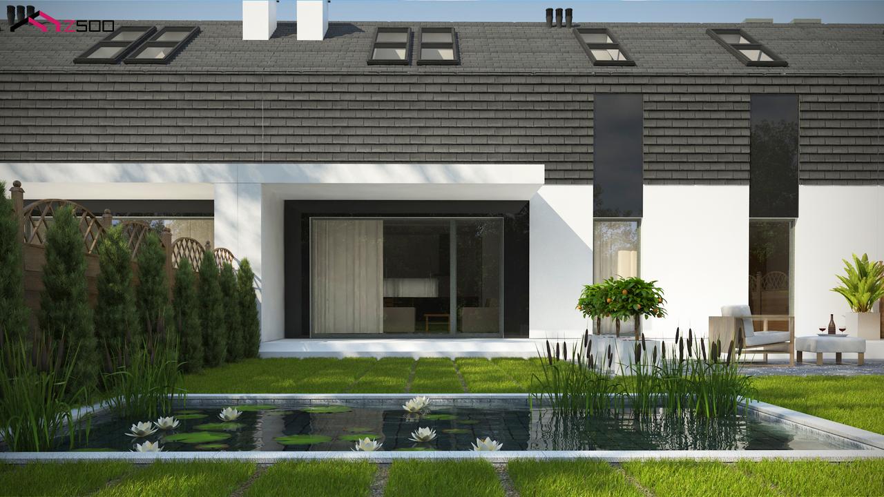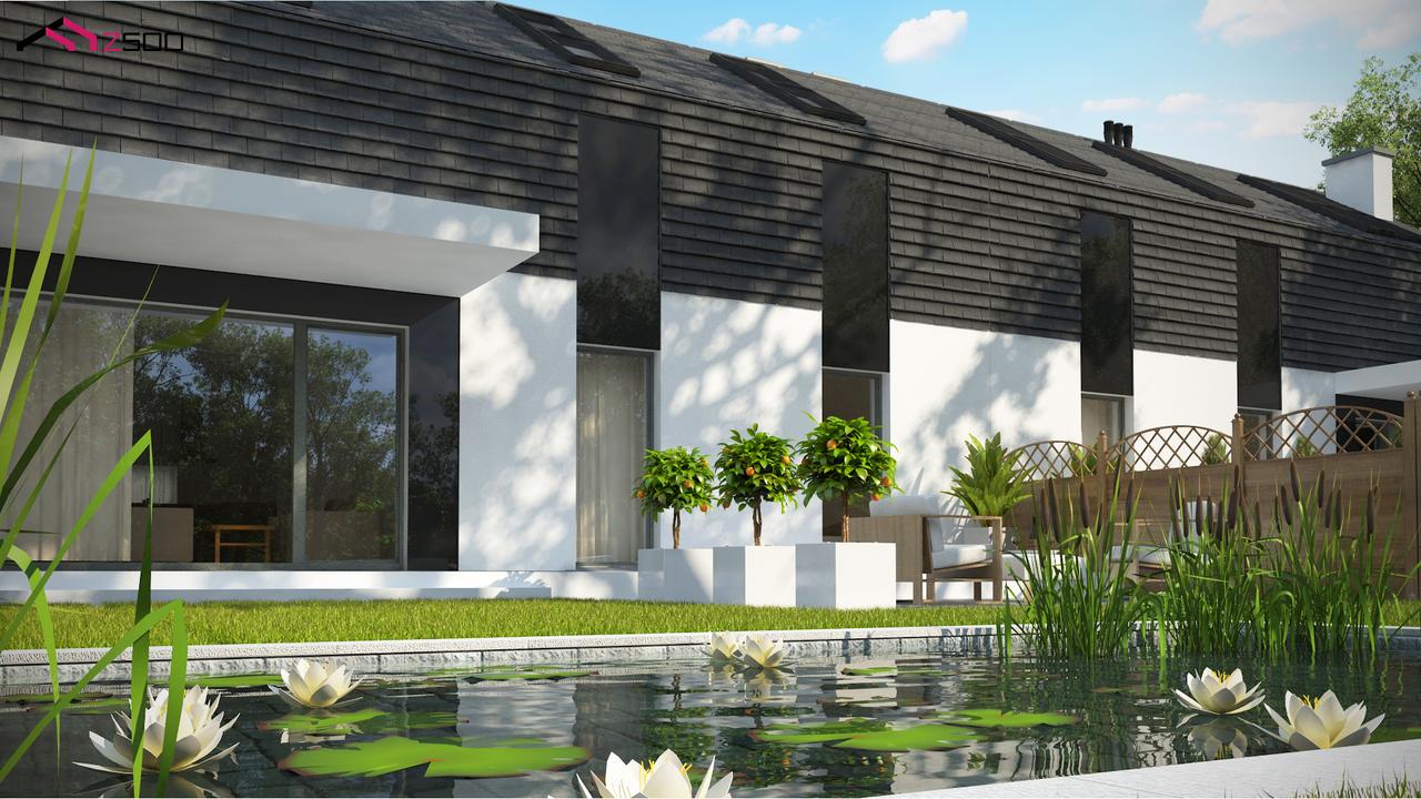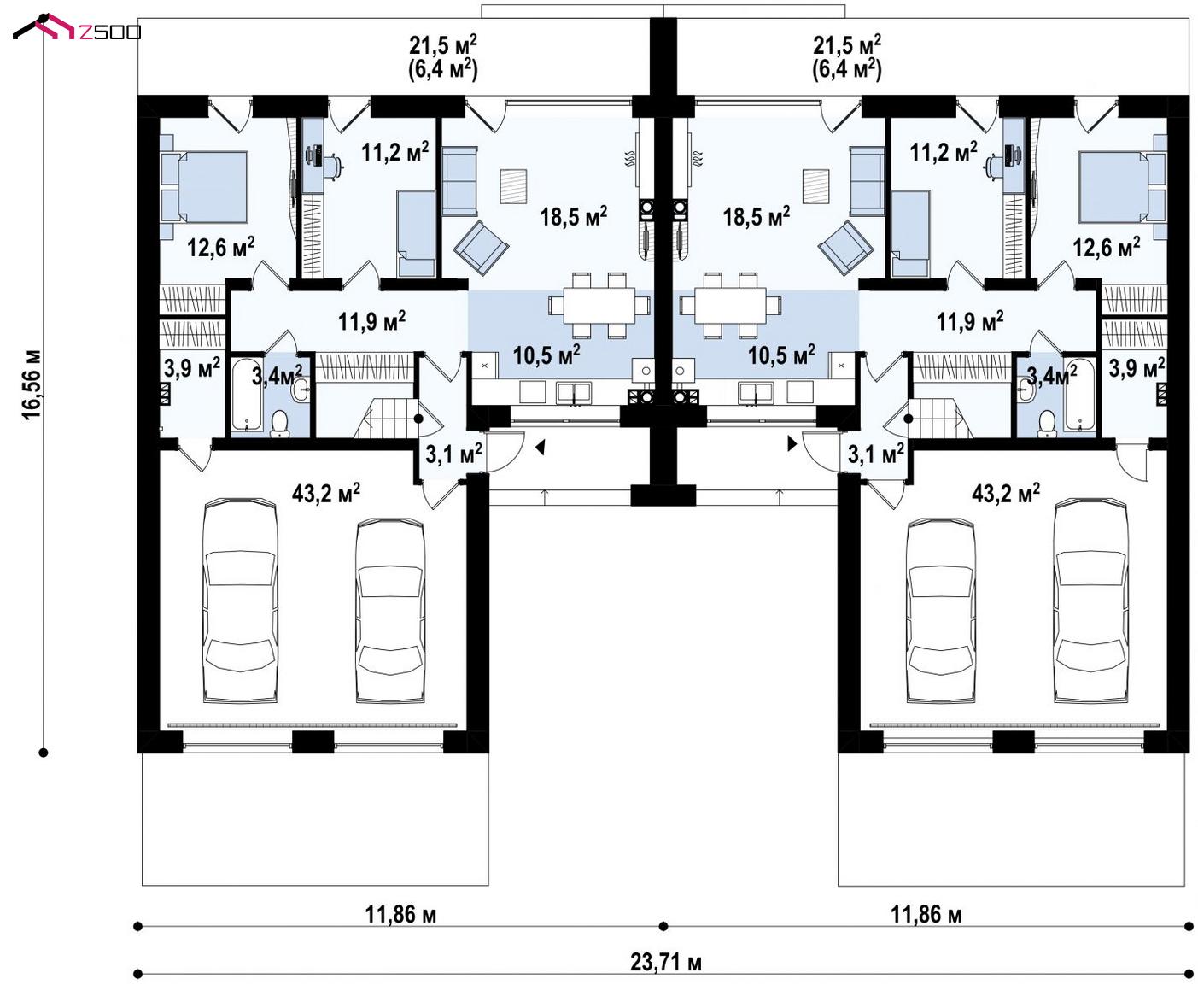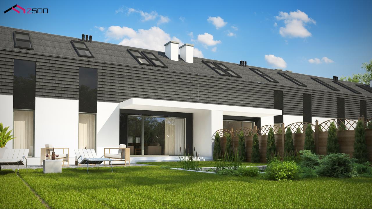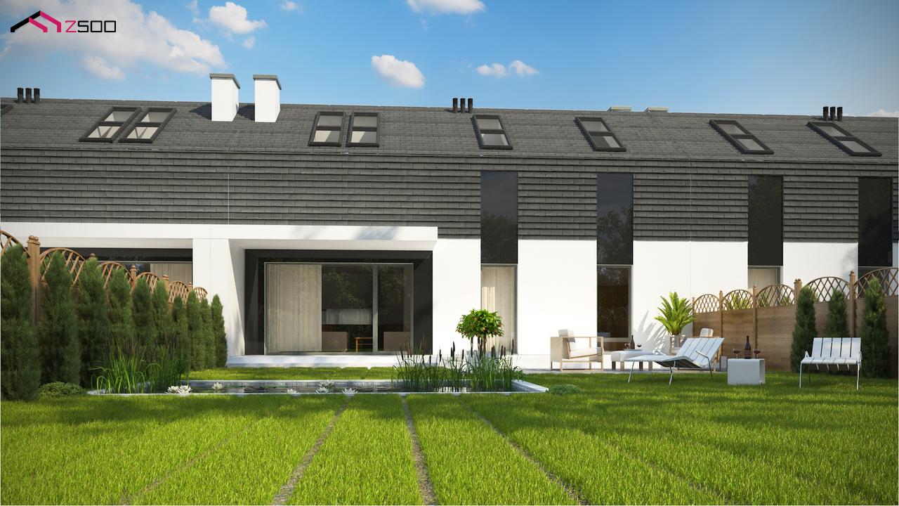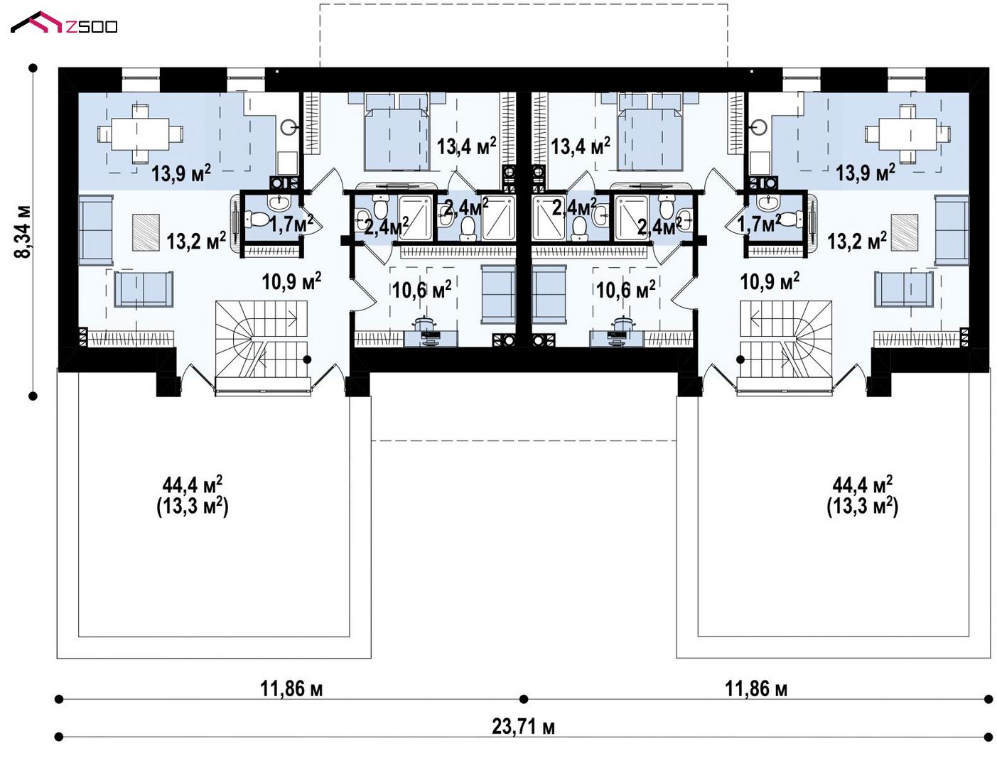Zb17 — это проект коттеджа на две семьи. На первом этаже располагается одна квартира, на втором этаже — другая. Отсутствие окон в боковых стенах дома дают возможность последовательной застройки.
