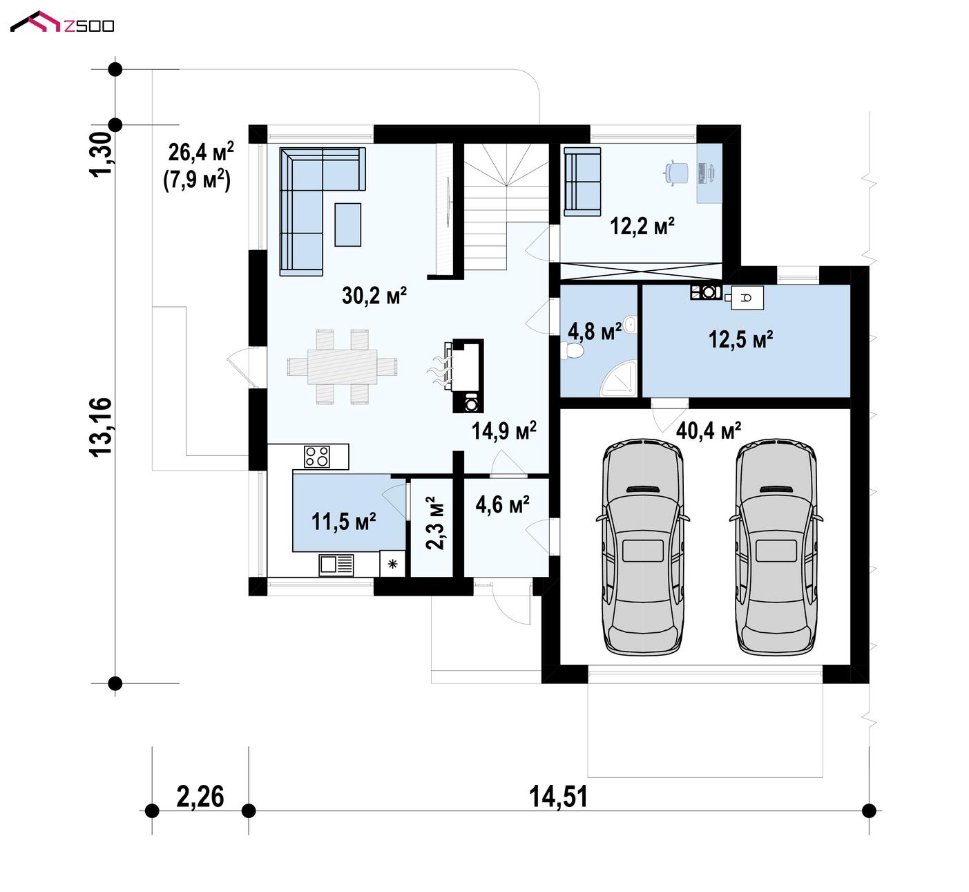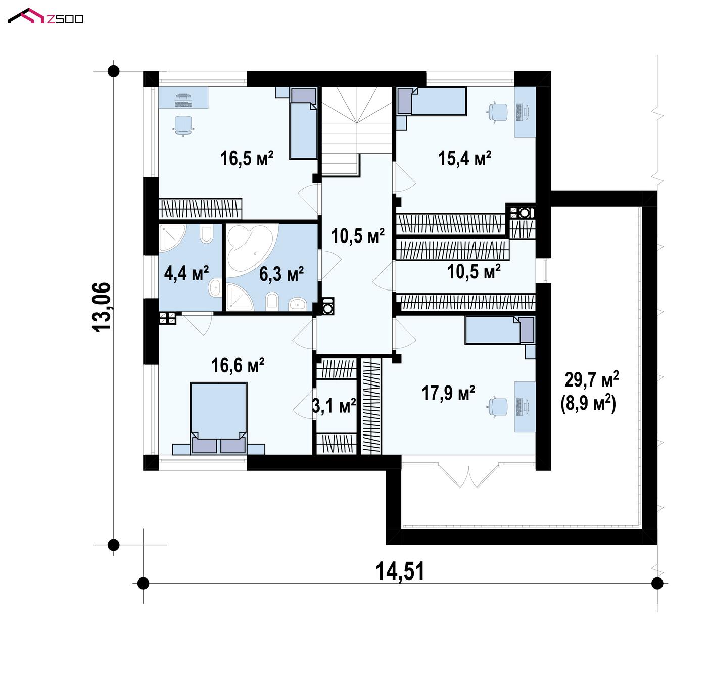 Разработка Zb2 представляет проект просторного двухэтажного дома для симметричной застройки с террасой над гаражом. Именно обширная угловая терраса второго уровня, расположенная со стороны фасада, становится главным украшением экстерьера здания.