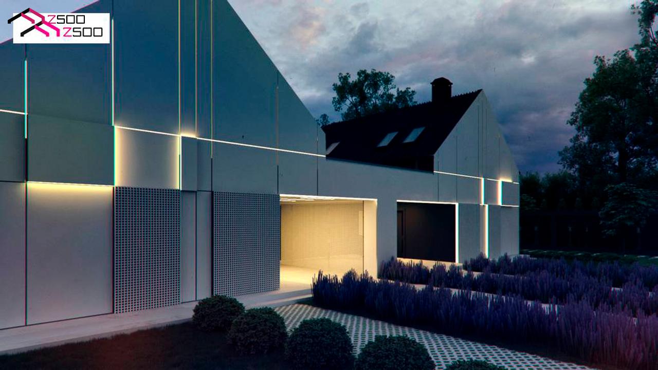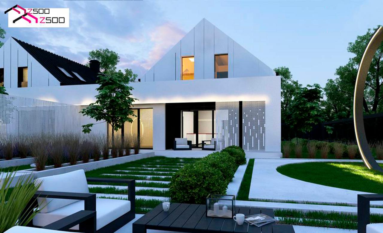 Zb37 представляет собой современный двухсемейный дом с двускатной крышей и навесом для одного автомобиля.