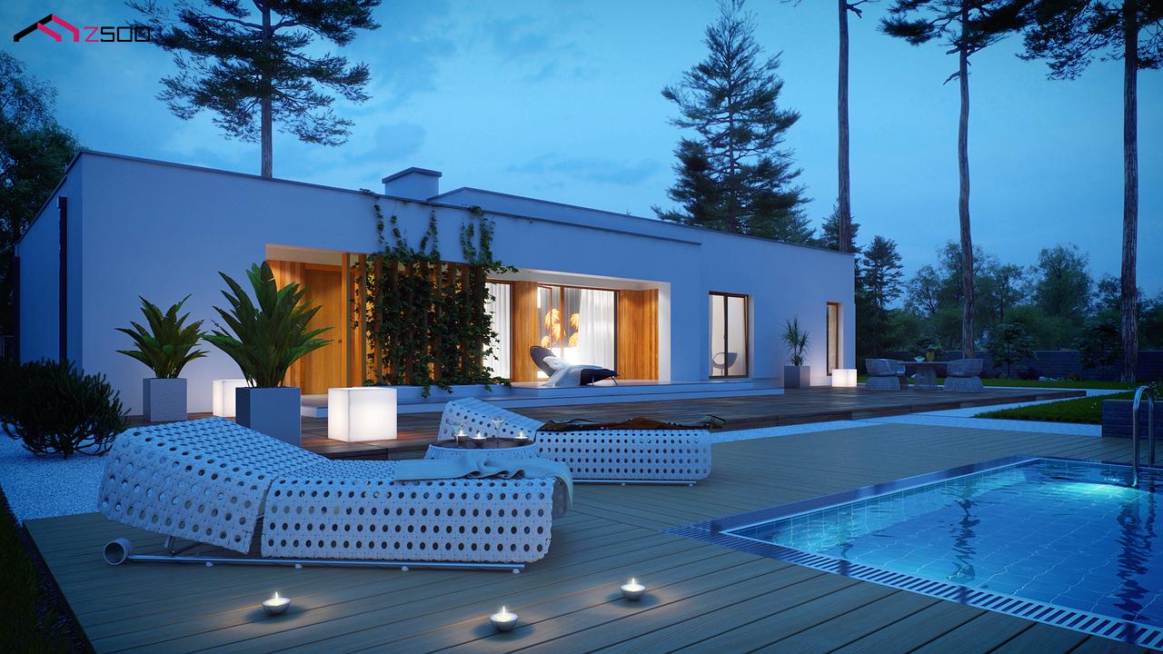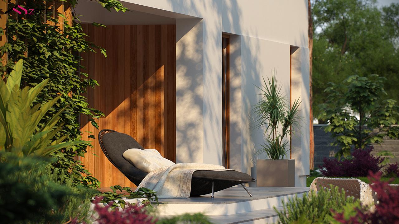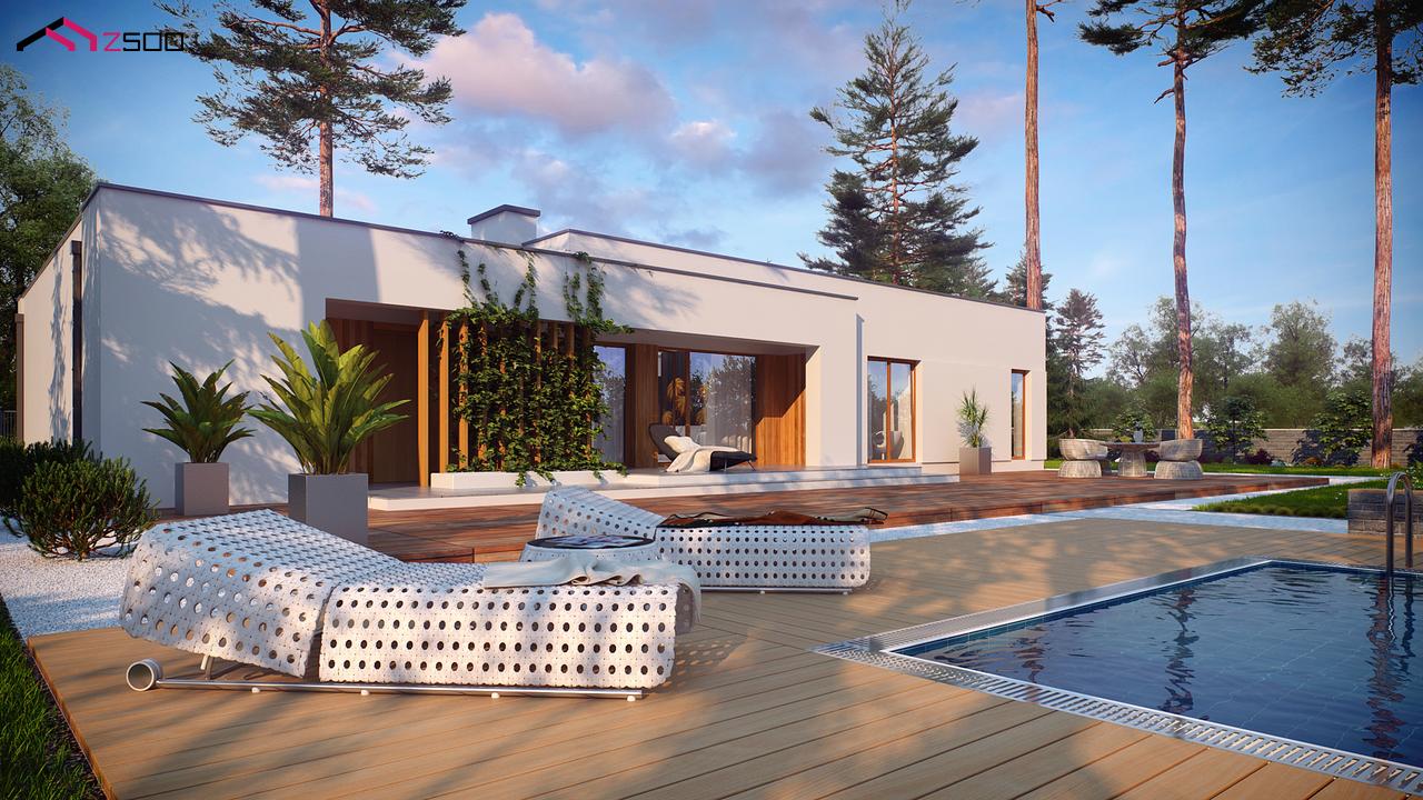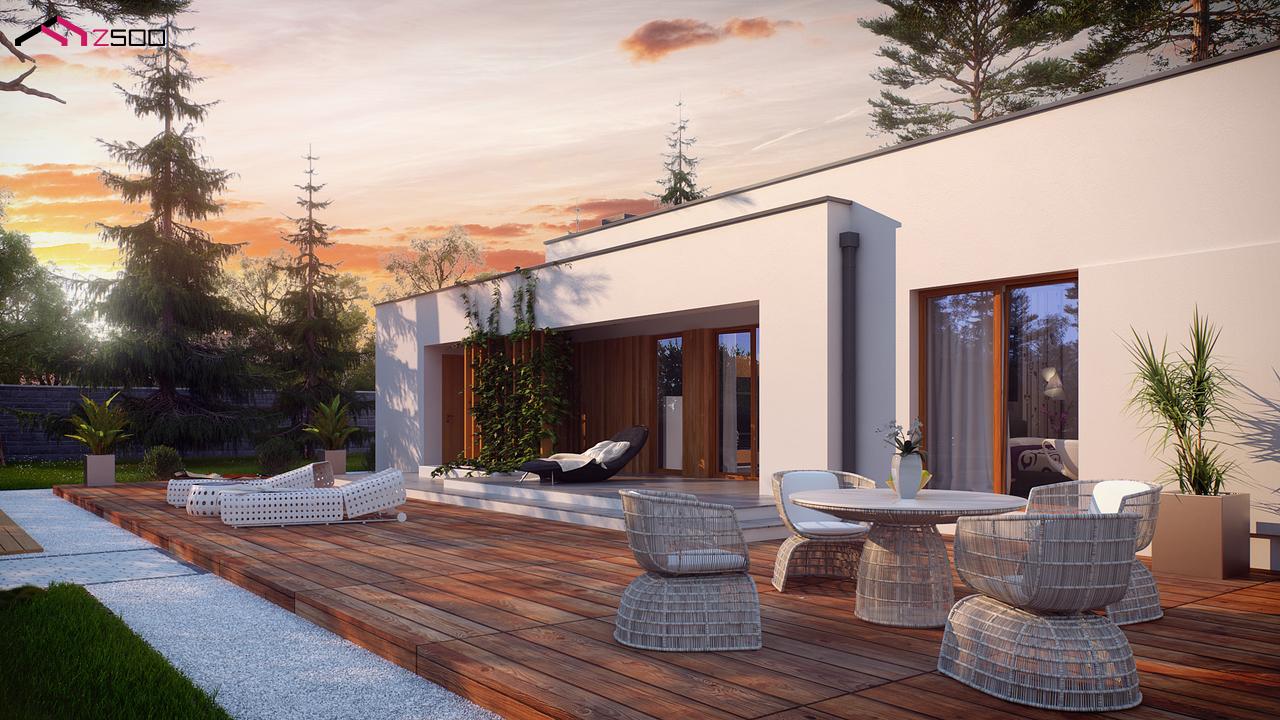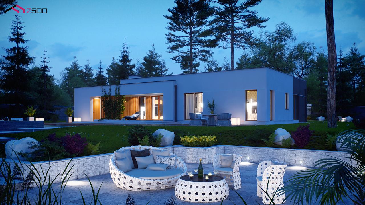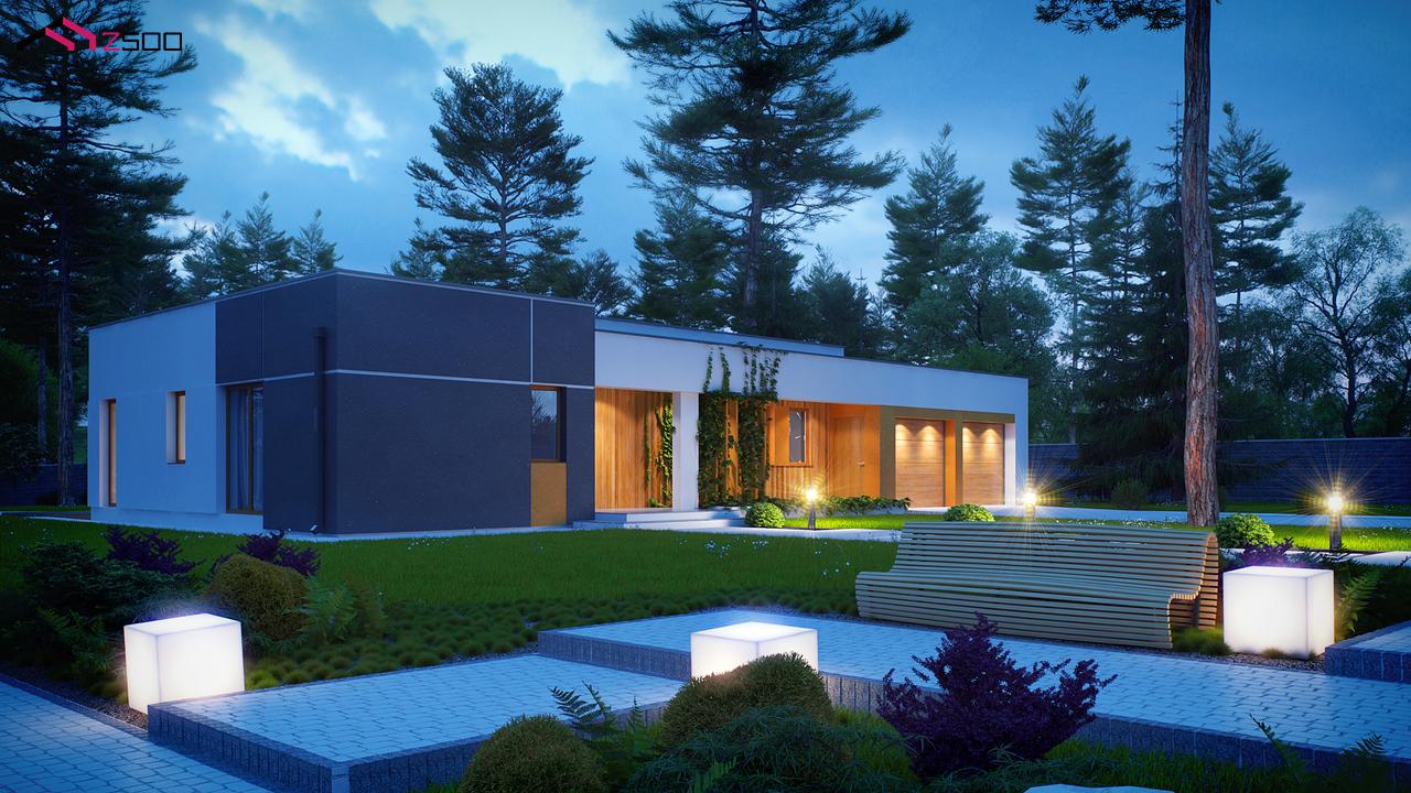 Zx102 – комфортный одноэтажный дом в современном стиле с гаражом для двух авто. Он идеально подойдёт для загородной резиденции. Простую кубическую форму подчёркивает сдержанность тонов внешней отделки – белый и серый, а деревянные элементы создают ощущение загородного уюта, к которому так стремится современный человек.