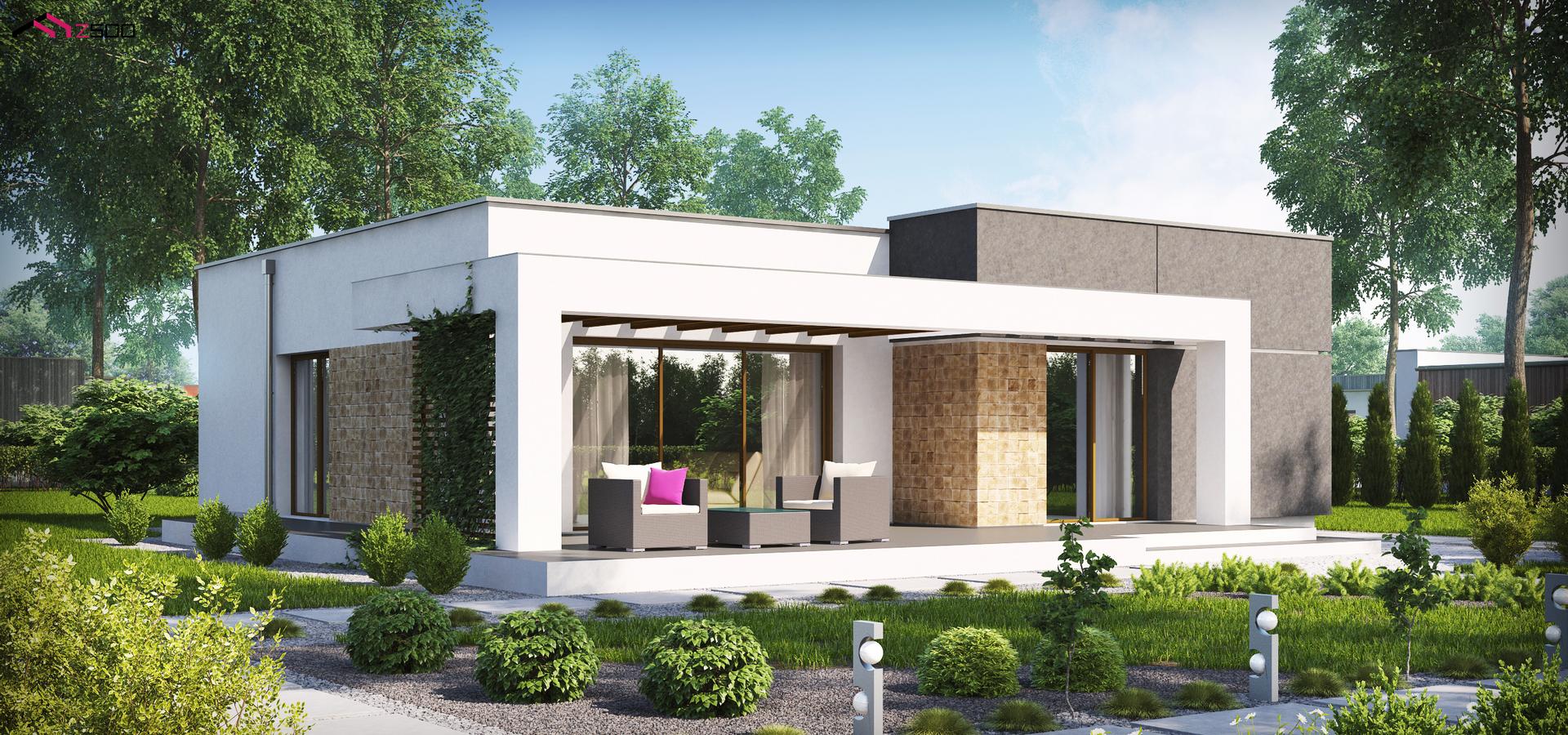 Zx105 — элегантный, практичный и экономичный дом в стиле хай-тек небольшой по размеру. Изысканный стиль дома подчёркивает не только кубическая форма в основе, но и внешняя отделка, для которой используются белый и серый цвет, а так же элементы каменной кладки тёплого песочного оттенка.