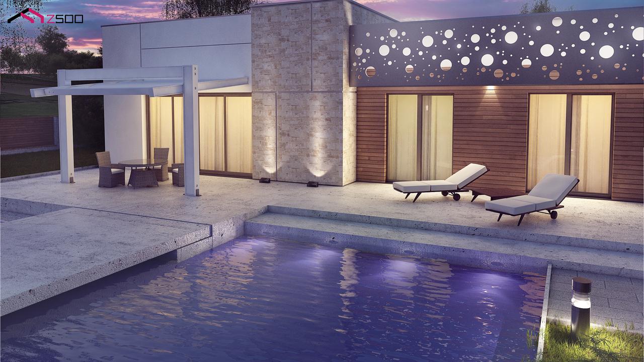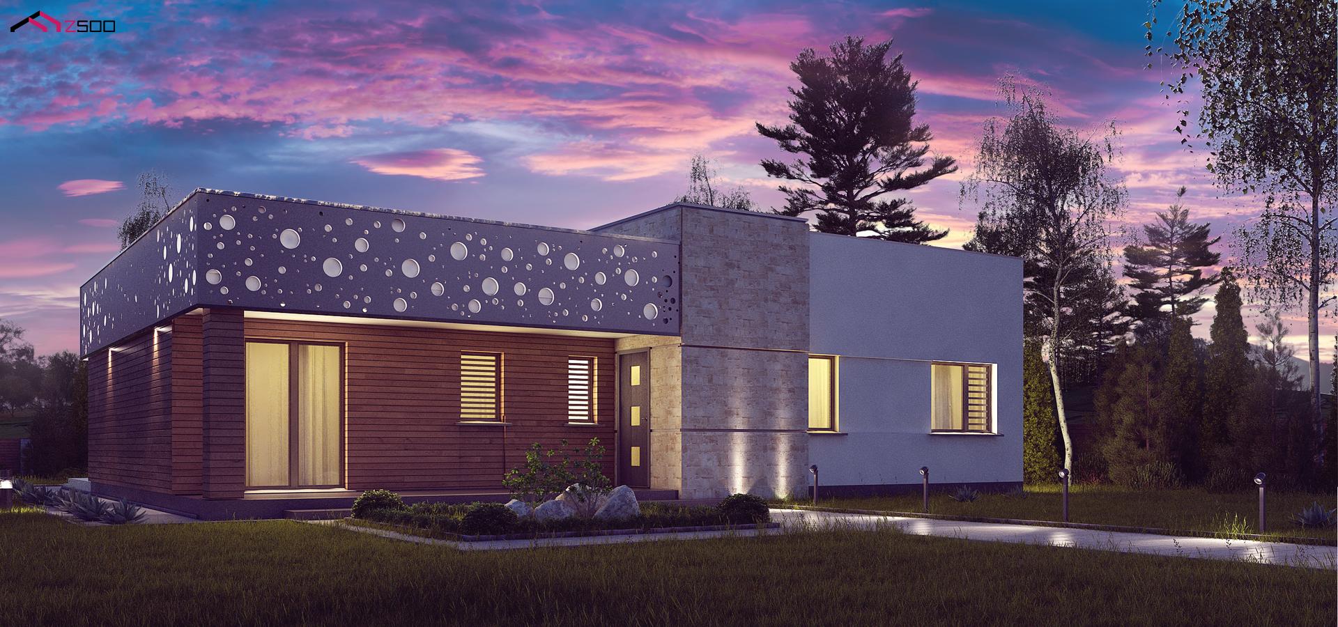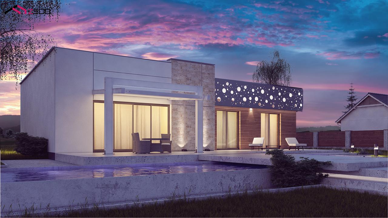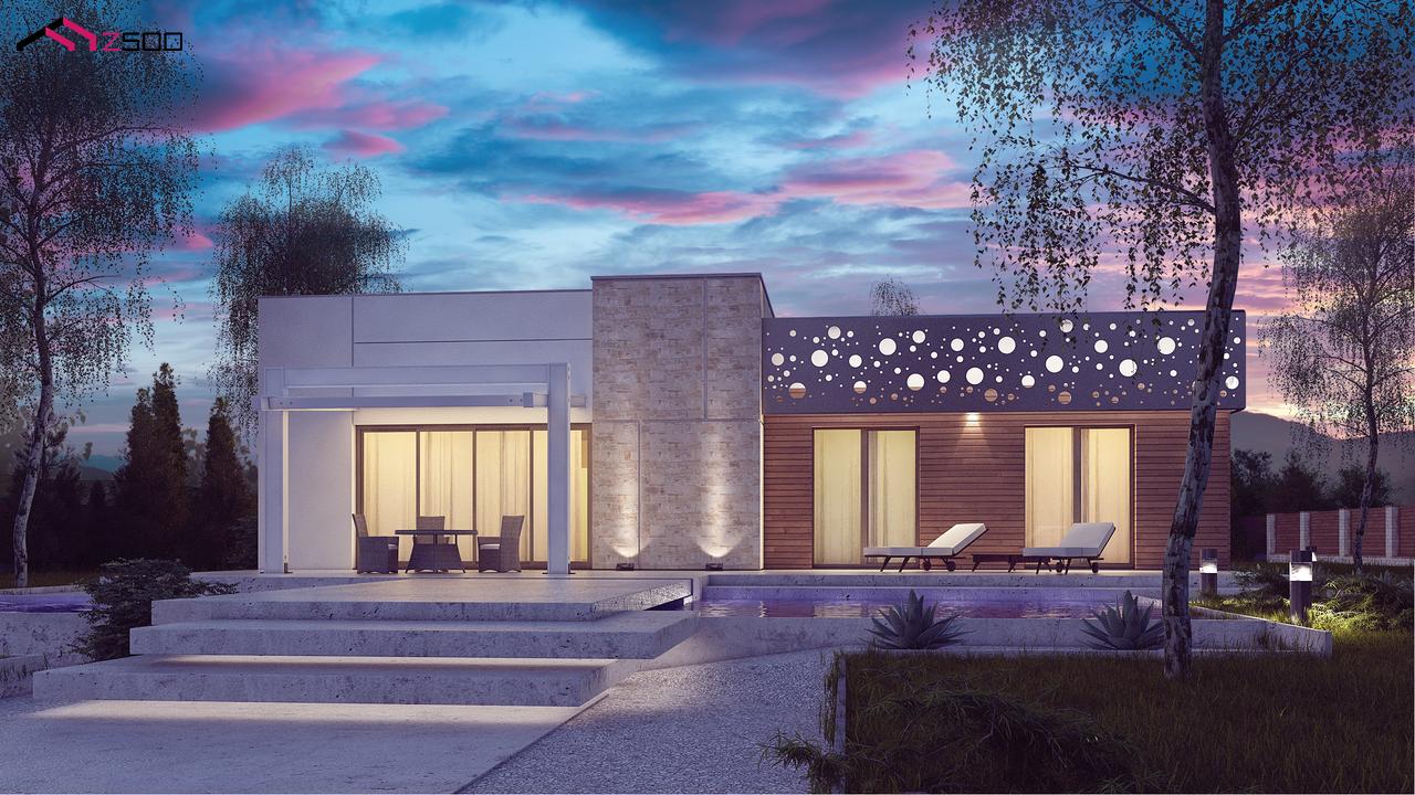 Zx115 — функциональный одноэтажный дом в современном стиле с плоской кровлей. Чёткие линии простой кубической формы дома украшены оригинальным орнаментом. Для внешней отделки выбраны белый цвет, серо-бежевый кирпич и дерево.