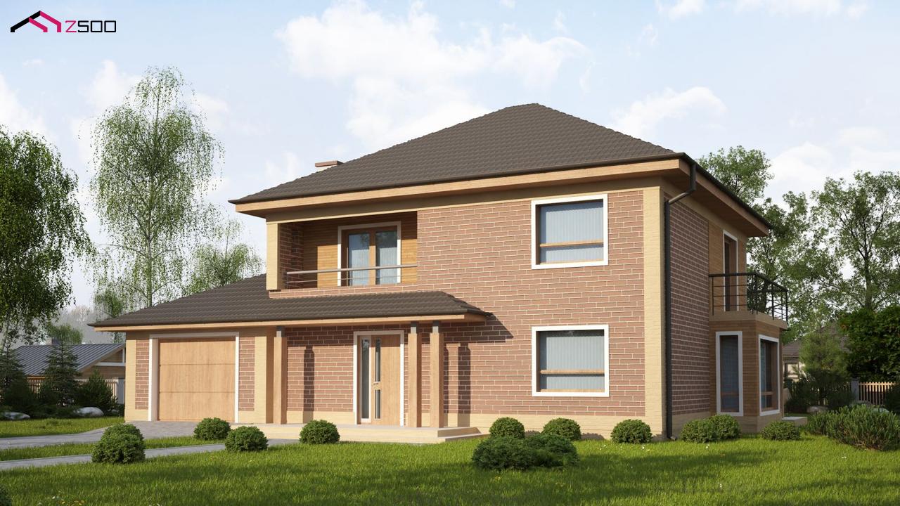 Zx12 k – проект комфортного двухэтажного дома с гаражом. Фасады в кирпичной облицовке.