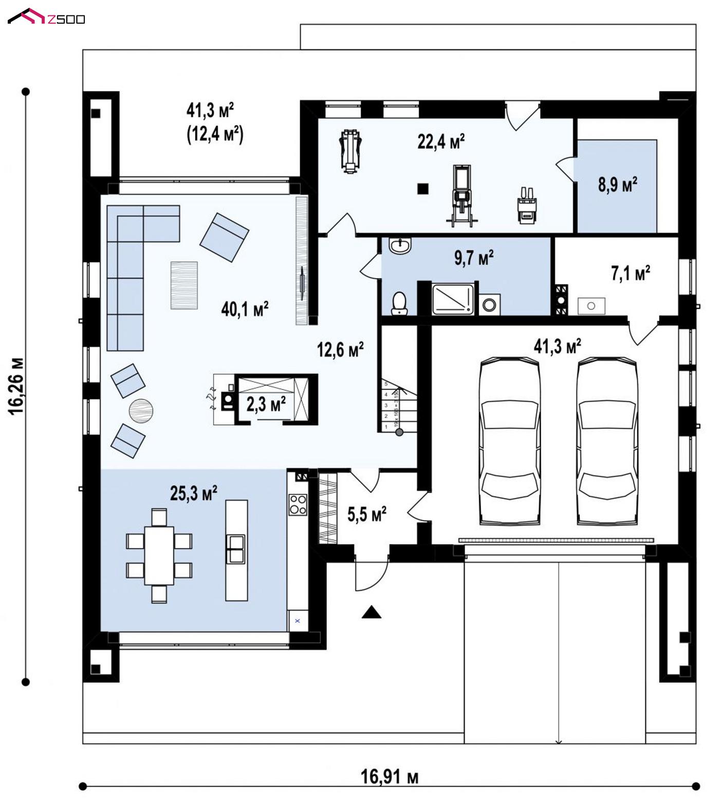 Zx123 GP2 – увеличенный вариант проекта Zx123 с гаражом на две машины, кладовой и сауной.