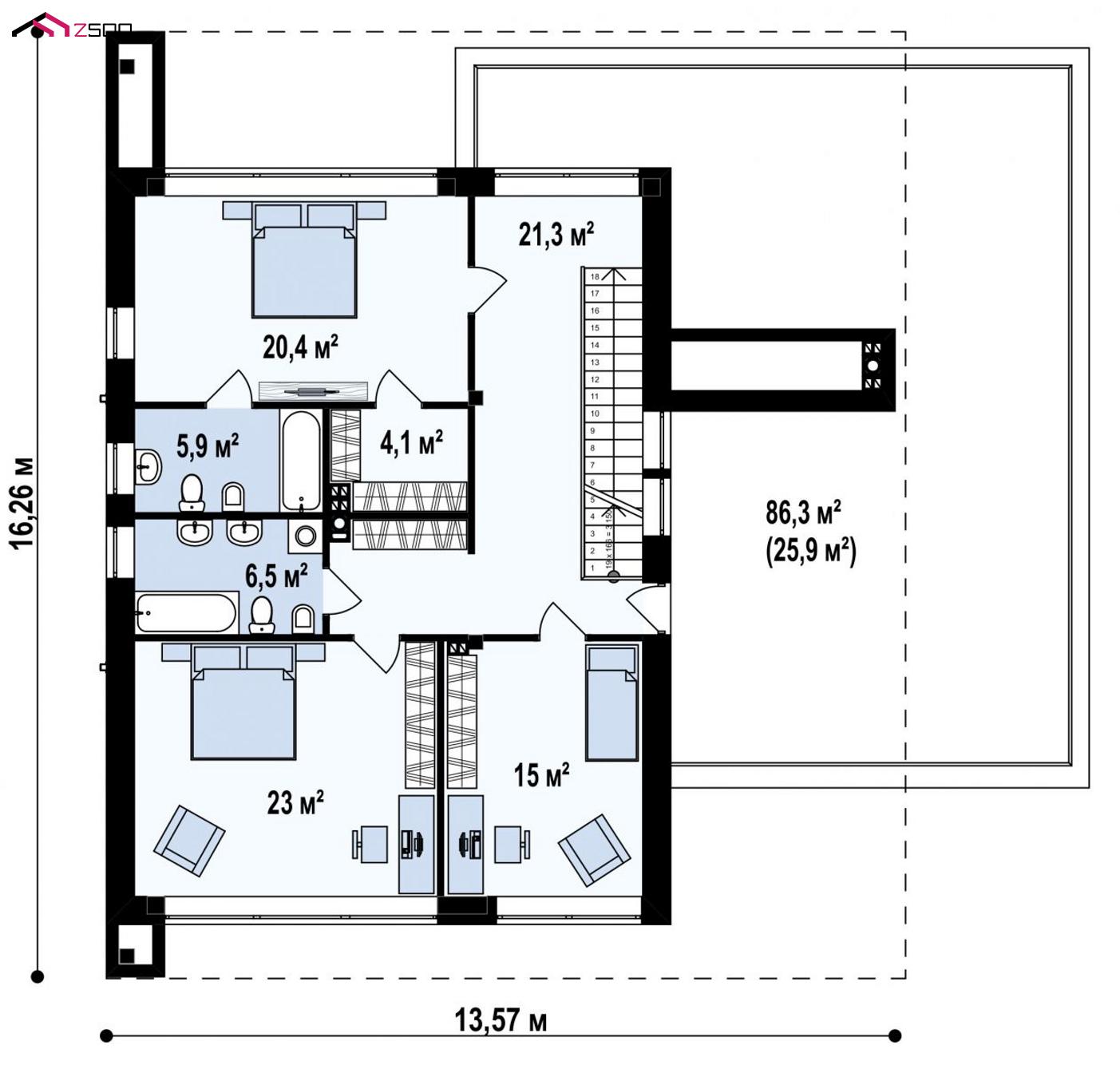 Увеличенный вариант проекта Zx123 с гаражом на две машины, кладовой и сауной.