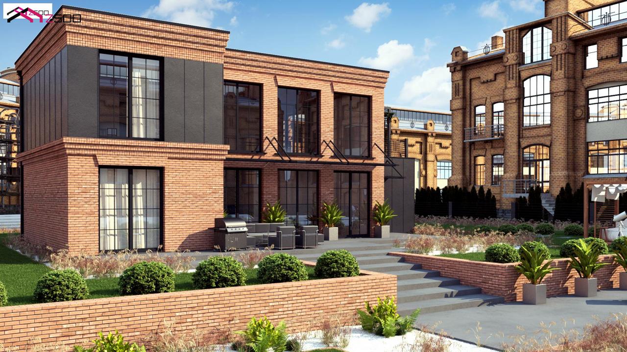 Современный двухэтажный дом с облицовкой фасада из кирпича