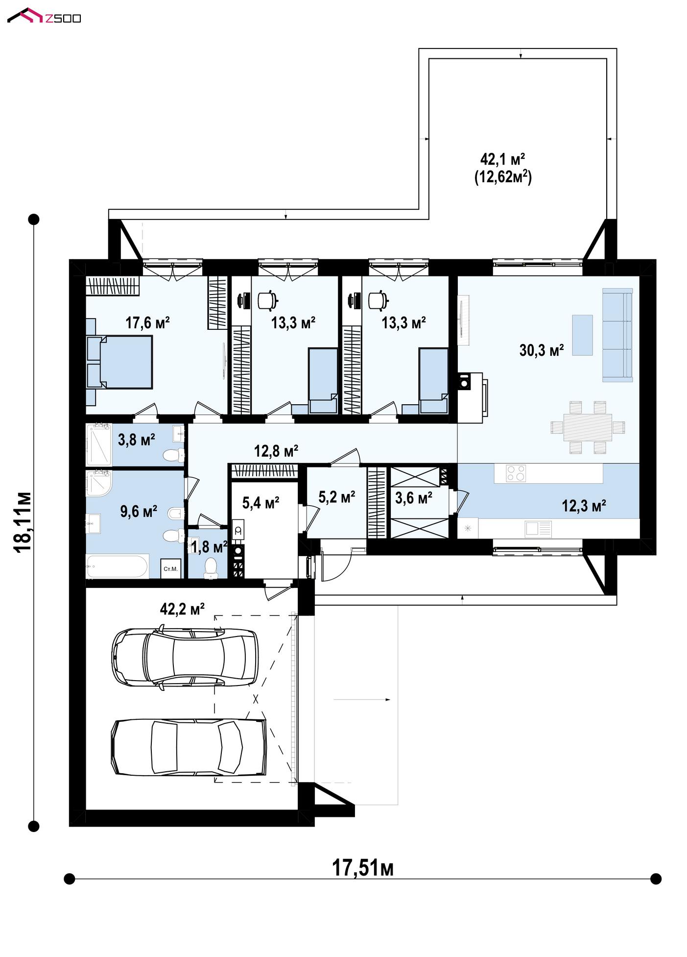 Проект Zx135 разработан специально для тех, кто отдает предпочтение одноуровневым планировкам. Аккуратный элегантный внешний облик делает дом актуальным в любой местности.